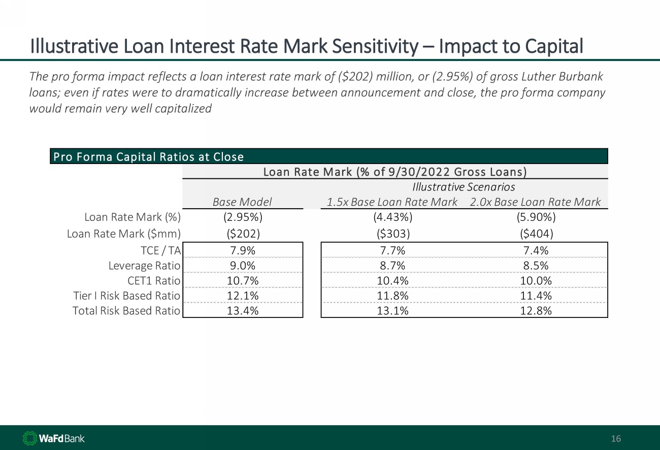 15 Key Assumptions (1) Amortized in the pro forma financials over a range of 1 to 10 years. Loan Credit Marks • Gross credit mark: $36.0 million, or 0.53% of total loans (equal to 1.0x reserve) • Non - PCD loan credit mark: $21.6 million, accreted back into earnings over 4 years using sum - of - years digits • PCD loan credit mark: $14.4 million • Establishment of new reserve equal to $14.4 million Interest Rate Marks (pre - tax) • Net rate mark (excluding AOCI) of 2.51%, expressed as a percentage of gross loans • ($ 202) million of loans rate mark accreted straight - line over 3.4 years • ($52) million of securities rate mark (including AOCI) accreted straight - line over 5 years • $37 million (1) of time deposits, brokered CDs, FHLB borrowings, trust preferred securities and senior debt Other Assumptions • ($59) million of deferred loan fees (pre - tax) accreted straight - line over 8 years • Core deposit intangible: 1.0% of LBC’s $3.2 billion core deposits, amortized using sum - of - years - digits over 7 years • No estimated annual interchange revenue loss attributable to Durbin Synergies • Cost savings estimated at 25% of LBC’s 2023 estimated noninterest expense • Phased in 50% in 2023 and 100% thereafter Earnings Assumptions • WAFD’s earnings per Street consensus estimates • LBC’s earnings per Street consensus estimates less 30% given Luther Burbank’s liability - sensitive balance sheet and adjusted for a September 30 fiscal year end Merger Costs • One - time merger expenses: $37.0 million, pre - tax Due Diligence • Comprehensive financial, legal, regulatory and operational due diligence conducted