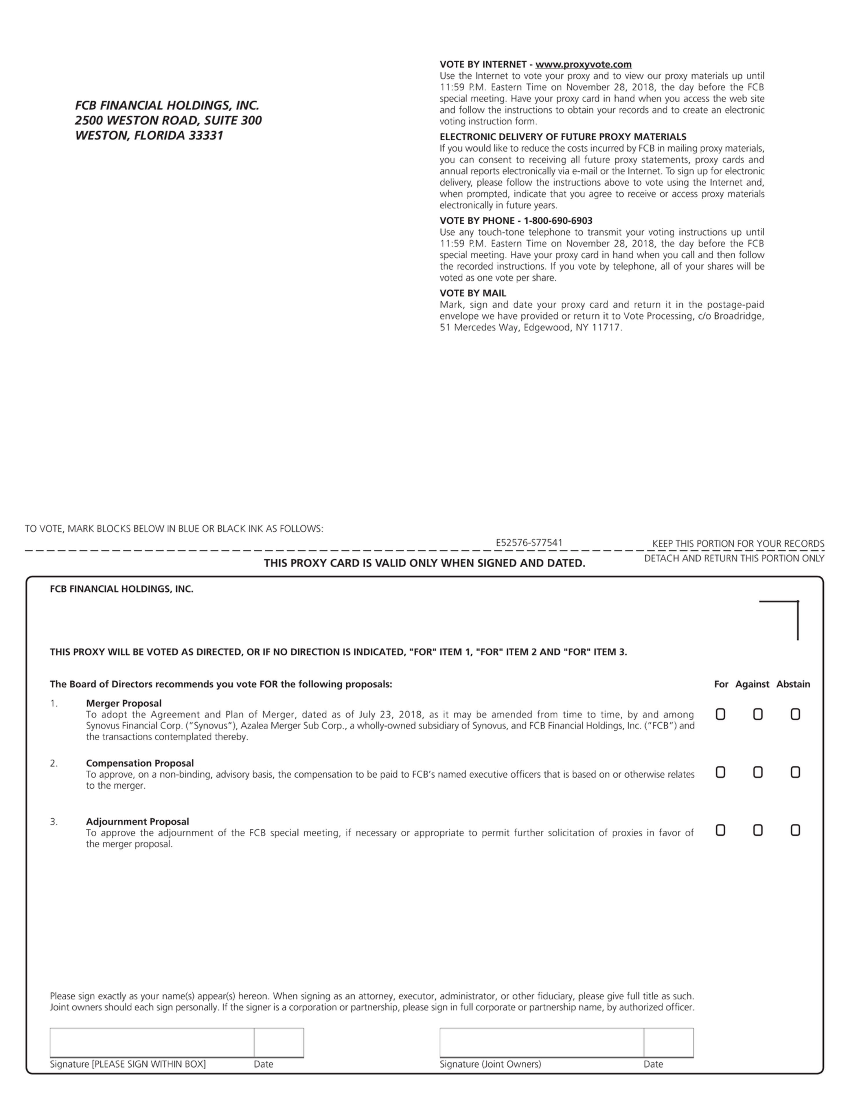 | 1. | To consider and vote on the proposal to adopt the Agreement and Plan of Merger, dated as of July 23, 2018, as it may be amended from time to time (which we refer to as the “merger agreement”), by and among Synovus Financial Corp. (which we refer to as “Synovus”), Azalea Merger Sub Corp., a wholly-owned subsidiary of Synovus, and FCB (which we refer to as the “merger proposal”); |