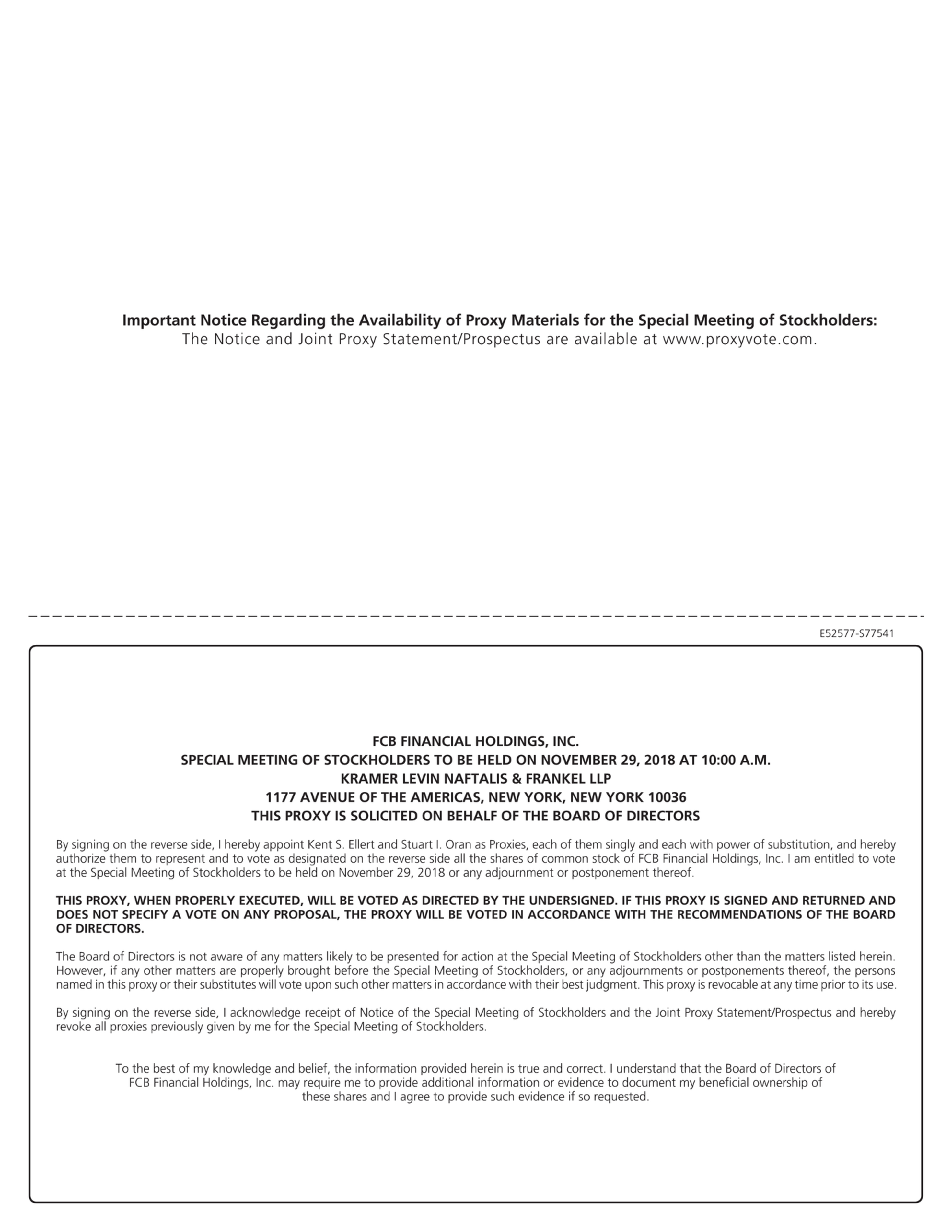 NOTICE IS HEREBY GIVEN that a special meeting (which we refer to as the “FCB special meeting”) of the stockholders of FCB Financial Holdings, Inc. (which we refer to as “FCB”) will be held on November 29, 2018, at 10:00 A.M. local time, at the offices of Kramer Levin Naftalis & Frankel LLP at 1177 Avenue of the Americas, New York, New York 10036 for the following purposes: