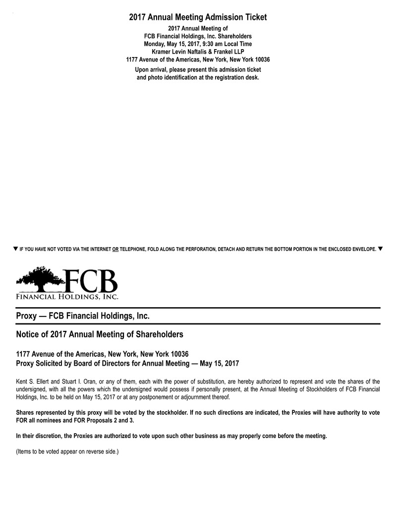 NOTICE IS HEREBY GIVEN that the Annual Meeting of Stockholders of FCB Financial Holdings, Inc., a Delaware corporation, will be held at the offices of Kramer Levin Naftalis & Frankel LLP at 1177 Avenue of the Americas, New York, New York 10036 on May 15, 2017 beginning at 9:30 a.m. (local time) for the following purposes: