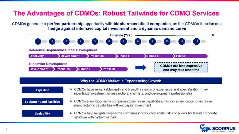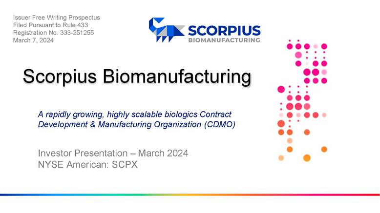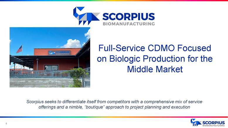 This presentation includes statements that are, or may be deemed, “forward - looking statements” within the meaning of the Private Securities Litigation Reform Act of 1995 , as amended . In some cases, these forward - looking statements can be identified by the use of forward - looking terminology, including the terms “believes”, “estimates”, “anticipates”, “expects”, “plans”, “intends”, “may”, “could”, “might”, “will”, “should”, “approximately” or, in each case, their negative or other variations thereon or comparable terminology, although not all forward - looking statements contain these words . They appear in a number of places throughout this presentation and include statements regarding our intentions, beliefs, projections, outlook, analyses or current expectations, concerning, among other things, the demand for contract development & manufacturing organization services growing, our recognizing revenue in 2024 from over $ 20 M in Scorpius signed manufacturing contracts, expected high margins and long - term profitability, leveraging fixed costs as revenue continues to grow resulting in high margins and long - term profitability, being well positioned to capitalize on the growing market, becoming cash flow positive by early 2025 the industry in which we operate and the trends that may affect the industry or us and statements regarding preliminary unaudited results . By their nature, forward - looking statements involve risks and uncertainties because they relate to events, competitive dynamics, and healthcare, regulatory and scientific developments and depend on the economic circumstances that may or may not occur in the future or may occur on longer or shorter timelines than anticipated . Although we believe that we have a reasonable basis for each forward - looking statement contained in this presentation, we caution you that forward - looking statements are not guarantees of future performance and that our actual results of operations, financial condition and liquidity, and the development of the industry in which we operate may differ materially from the forward - looking statements contained in this presentation as a result of, among other factors, the factors referenced in the “Risk Factors” section of our Annual Report on Form 10 - K for the year ended December 31 , 2022 , our quarterly reports on Form 10 - Q for the subsequent quarters and our other subsequent filings with the Securities and Exchange Commission (collectively, our “SEC Filings”) . In addition, even if results of operations, financial condition and liquidity, and the development of the industry in which we operate are consistent with the forward - looking statements contained in this presentation, they may not be predictive of results or developments in future periods . Any forward - looking statements that we make in this presentation speak only as of the date of such statement, and we undertake no obligation to update such statements to reflect events or circumstances after the date of this presentation, except as required by law . Forward Looking Statement 2