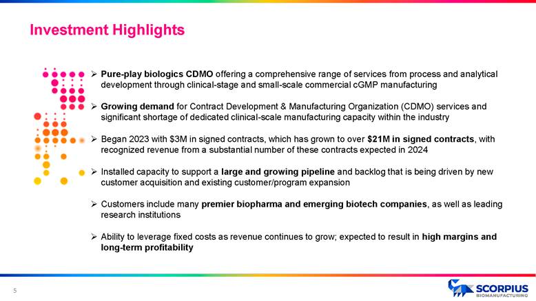 Investment Highlights » Pure - play biologics CDMO offering a comprehensive range of services from process and analytical development through clinical - stage and small - scale commercial cGMP manufacturing » Growing demand for Contract Development & Manufacturing Organization (CDMO) services and significant shortage of dedicated clinical - scale manufacturing capacity within the industry » Began 2023 with $3M in signed contracts, which has grown to over $21M in signed contracts , with recognized revenue from a substantial number of these contracts expected in 2024 » Installed capacity to support a large and growing pipeline and backlog that is being driven by new customer acquisition and existing customer/program expansion » Customers include many premier biopharma and emerging biotech companies , as well as leading research institutions » Ability to leverage fixed costs as revenue continues to grow; expected to result in high margins and long - term profitability 4