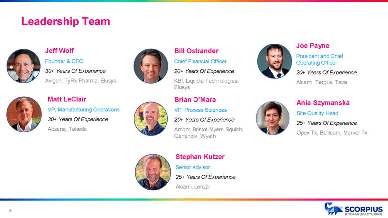 Leadership Team Joe Payne President and Chief Operating Officer 20+ Years Of Experience Alcami, Tergus, Teva Brian O’Mara VP, Process Sciences 20+ Years Of Experience Ambrx, Bristol - Myers Squibb, Genencor, Wyeth Stephan Kutzer Senior Advisor 25+ Years Of Experience Alcami, Lonza Matt LeClair VP, Manufacturing Operations 30+ Years Of Experience Abzena, Takeda Bill Ostrander Chief Financial Officer 20+ Years Of Experience KBI, Liquidia Technologies, Elusys Jeff Wolf Founder & CEO 30+ Years Of Experience Avigen, TyRx Pharma, Elusys Ania Szymanska Site Quality Head 25+ Years Of Experience Opex Tx, Bellicum, Marker Tx 5