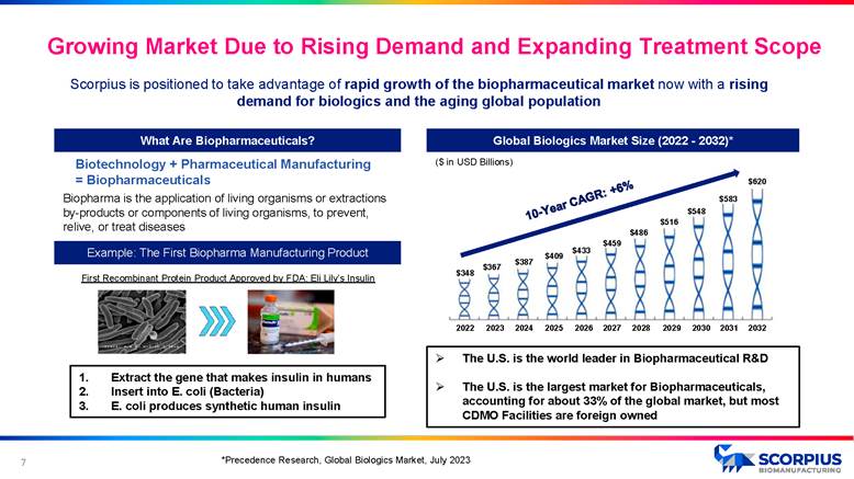 Scorpius is positioned to take advantage of rapid growth of the biopharmaceutical market now with a rising demand for biologics and the aging global population *Precedence Research, Global Biologics Market, July 2023 Growing Market Due to Rising Demand and Expanding Treatment Scope 6 What Are Biopharmaceuticals? Global Biologics Market Size (2022 - 2032)* Biotechnology + Pharmaceutical Manufacturing = Biopharmaceuticals Biopharma is the application of living organisms or extractions by - products or components of living organisms, to prevent, relive, or treat diseases Example: The First Biopharma Manufacturing Product First Recombinant Protein Product Approved by FDA: Eli Lily’s Insulin 1. Extract the gene that makes insulin in humans 2. Insert into E. coli (Bacteria) 3. E. coli produces synthetic human insulin ($ in USD Billions) » The U.S. is the world leader in Biopharmaceutical R&D » The U.S. is the largest market for Biopharmaceuticals, accounting for about 33% of the global market, but most CDMO Facilities are foreign owned $348 $367 $387 $409 $433 $459 $486 $516 $548 $583 $620 2022 2023 2024 2025 2026 2027 2028 2029 2030 2031 2032