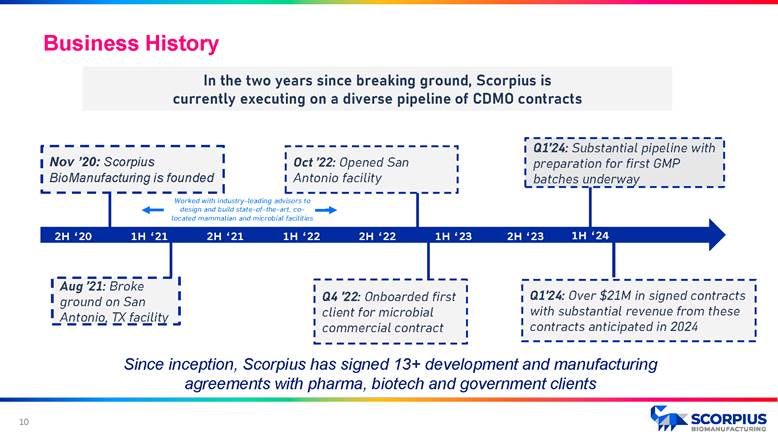 Nov ’20: Scorpius BioManufacturing is founded Aug ’21: Broke ground on San Antonio, TX facility Q4 ’22: Onboarded first client for microbial commercial contract Oct ’22: Opened San Antonio facility 2H ‘21 1H ‘22 2H ‘22 1H ‘23 2H ‘23 2H ‘20 1H ‘21 In the two years since breaking ground, Scorpius is currently executing on a diverse pipeline of CDMO contracts Q1’24: Substantial pipeline with preparation for first GMP batches underway Worked with industry - leading advisors to design and build state - of - the - art, co - located mammalian and microbial facilities 1H ‘24 Q1’24: Over $21M in signed contracts with substantial revenue from these contracts anticipated in 2024 Since inception, Scorpius has signed 13+ development and manufacturing agreements with pharma, biotech and government clients Business History 9