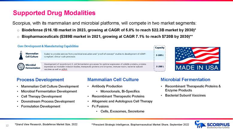 11 Supported Drug Modalities Mammalian Cell Culture • Antibody Production • Monoclonals, Bi - Specifics • Recombinant Therapeutic Proteins • Allogeneic and Autologous Cell Therapy • Fc Fusions • Cells, Exosomes, Secretome Microbial Fermentation • Recombinant Therapeutic Proteins & Enzyme Products • Bacterial Subunit Vaccines Scorpius, with its mammalian and microbial platforms, will compete in two market segments: o Biodefense ($16.1B market in 2023, growing at CAGR of 5.0% to reach $22.3B market by 2030)* o Biopharmaceuticals ($389B market in 2021, growing at CAGR 7.1% to reach $720B by 2030)** Process Development • Mammalian Cell Culture Development • Microbial Fermentation Development • Cell Therapy Development • Downstream Process Development • Formulation Development *Grand View Research, Biodefense Market Size, 2022 **Prescient Strategic Intelligence, Biopharmaceutical Market Share, September 2022