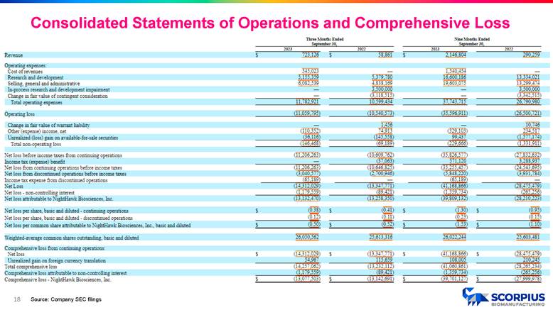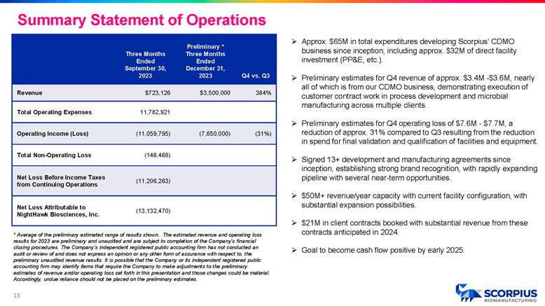 » Approx. $65M in total expenditures developing Scorpius’ CDMO business since inception, including approx. $32M of direct facility investment (PP&E, etc.). » Preliminary estimates for Q4 revenue of approx. $3.4M - $3.6M, nearly all of which is from our CDMO business, demonstrating execution of customer contract work in process development and microbial manufacturing across multiple clients. » Preliminary estimates for Q4 operating loss of $7.6M - $7.7M, a reduction of approx. 31% compared to Q3 resulting from the reduction in spend for final validation and qualification of facilities and equipment. » Signed 13+ development and manufacturing agreements since inception, establishing strong brand recognition, with rapidly expanding pipeline with several near - term opportunities. » $50M+ revenue/year capacity with current facility configuration, with substantial expansion possibilities. » $21M in client contracts booked with substantial revenue from these contracts anticipated in 2024. » Goal to become cash flow positive by early 2025. Q4 vs. Q3 Preliminary * Three Months Ended December 31, 2023 Three Months Ended September 30, 2023 384% $3,500,000 $723,126 Revenue 11,782,921 Total Operating Expenses (31%) (7,650,000) (11,059,795) Operating Income (Loss) (146,468) Total Non - Operating Loss (11,206,263) Net Loss Before Income Taxes from Continuing Operations (13,132,470) Net Loss Attributable to NightHawk Biosciences, Inc. * Average of the preliminary estimated range of results shown. The estimated revenue and operating loss results for 2023 are preliminary and unaudited and are subject to completion of the Company’s financial closing procedures. The Company’s independent registered public accounting firm has not conducted an audit or review of and does not express an opinion or any other form of assurance with respect to, the preliminary unaudited revenue results. It is possible that the Company or its independent registered public accounting firm may identify items that require the Company to make adjustments to the preliminary estimates of revenue and/or operating loss set forth in this presentation and those changes could be material. Accordingly, undue reliance should not be placed on the preliminary estimates. Summary Statement of Operations 12