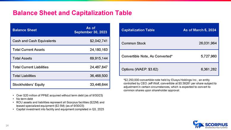 As of September 30, 2023 Balance Sheet $2,042,741 Cash and Cash Equivalents 24,180,163 Total Current Assets 69,915,144 Total Assets 24,487,847 Total Current Liabilities 36,468,500 Total Liabilities 33,446,644 Stockholders’ Equity As of March 5, 2024 Capitalization Table 26,031,964 Common Stock 5,727,960 Convertible Note, As Converted* 6,361,282 Options (WAEP: $3.62) *$2,250,000 convertible note held by Elusys Holdings Inc., an entity controlled by CEO Jeff Wolf, convertible at $0.39281 per share subject to adjustment in certain circumstances, which is expected to convert to common shares upon shareholder approval. • Over $20 million of PP&E acquired without term debt (as of 9/30/23) • No term debt • ROU assets and liabilities represent all Scorpius facilities ($22M) and leased specialized equipment ($2.5M) (as of 9/30/23) • Capital investment into facility and equipment completed in Q3, 2023 Balance Sheet and Capitalization Table 13