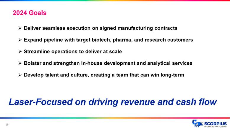 2024 Goals » Deliver seamless execution on signed manufacturing contracts » Expand pipeline with target biotech, pharma, and research customers » Streamline operations to deliver at scale » Bolster and strengthen in - house development and analytical services » Develop talent and culture, creating a team that can win long - term Laser - Focused on driving revenue and cash flow 14