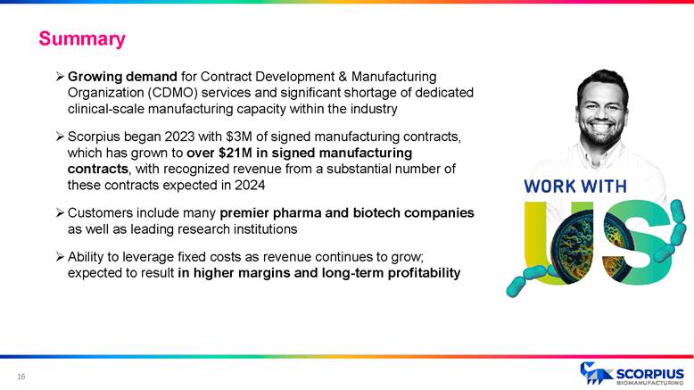 Summary 15 » Growing demand for Contract Development & Manufacturing Organization (CDMO) services and significant shortage of dedicated clinical - scale manufacturing capacity within the industry » Scorpius began 2023 with $3M of signed manufacturing contracts, which has grown to over $21M in signed manufacturing contracts , with recognized revenue from a substantial number of these contracts expected in 2024 » Customers include many premier pharma and biotech companies as well as leading research institutions » Ability to leverage fixed costs as revenue continues to grow; expected to result in higher margins and long - term profitability