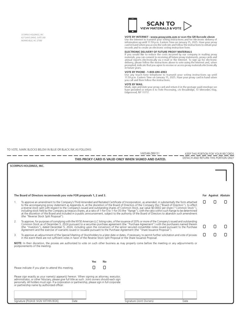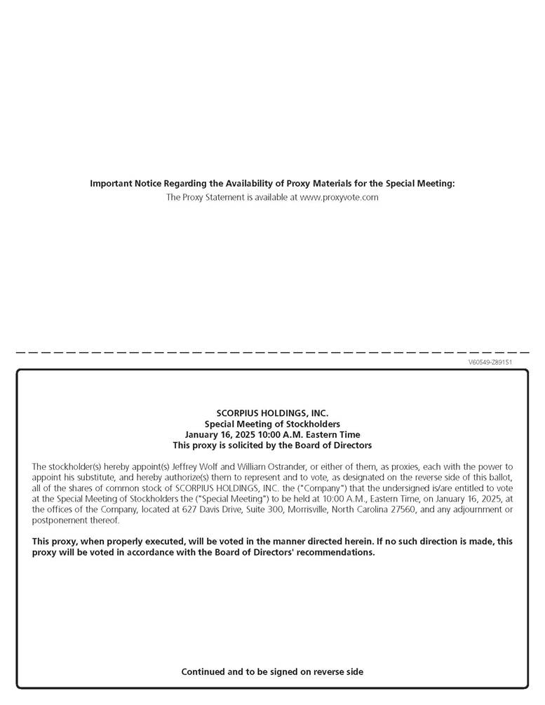 We hereby notify you that a special meeting of stockholders (the “Special Meeting”) of Scorpius Holdings, Inc., a Delaware corporation (the “Company”), will be held on January 16, 2025 beginning at 10:00 a.m. Eastern Time, at the Company’s offices, 627 Davis Drive, Suite 300, Morrisville, North Carolina 27560, for the following purposes: