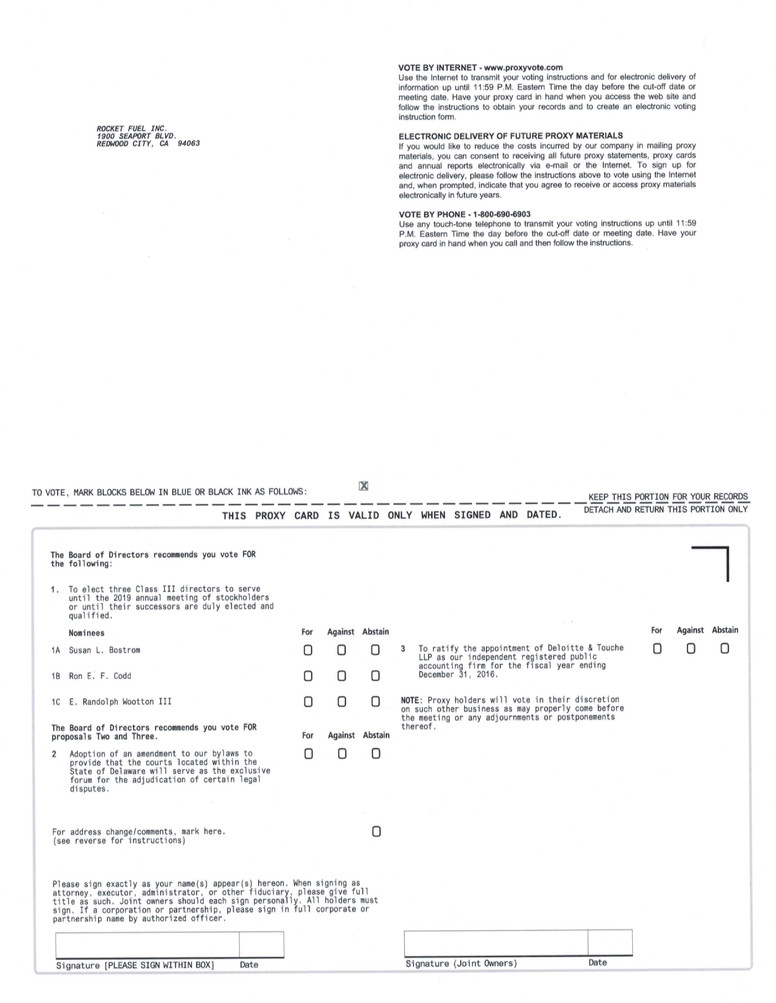 We cordially invite you to attend our 2016 Annual Meeting of Stockholders. The Annual Meeting will be held on Tuesday, June 14, 2016, at 9:00 a.m. Pacific Time at the principal executive offices of Rocket Fuel Inc., which are located at 1900 Seaport Boulevard, Redwood City, CA 94063.