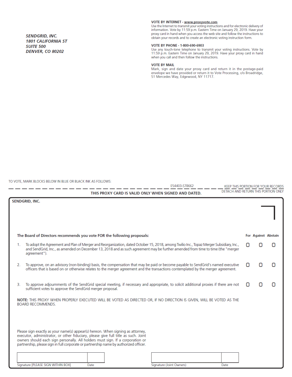 VOTE BY INTERNET - www.proxyvote.com Use the Internet to transmit your voting instructions and for electronic delivery of information. Vote by 11:59 p.m. Eastern Time on January 29, 2019. Have your proxy card in hand when you access the web site and follow the instructions to obtain your records and to create an electronic voting instruction form. SENDGRID, INC. 1801 CALIFORNIA ST SUITE 500 DENVER, CO 80202 VOTE BY PHONE - 1-800-690-6903 Use any touch-tone telephone to transmit your voting instructions. Vote by 11:59 p.m. Eastern Time on January 29, 2019. Have your proxy card in hand when you call and then follow the instructions. VOTE BY MAIL Mark, sign and date your proxy card and return it in the postage-paid envelope we have provided or return it to Vote Processing, c/o Broadridge, 51 Mercedes Way, Edgewood, NY 11717. TO VOTE, MARK BLOCKS BELOW IN BLUE OR BLACK INK AS FOLLOWS: E54403-S78662 KEEP THIS PORTION FOR YOUR RECORDS DETACH AND RETURN THIS PORTION ONLY THIS PROXY CARD IS VALID ONLY WHEN SIGNED AND DATED. SENDGRID, INC. The Board of Directors recommends you vote FOR the following proposals: For Against Abstain ! ! ! 1. To adopt the Agreement and Plan of Merger and Reorganization, dated October 15, 2018, among Twilio Inc., Topaz Merger Subsidiary, Inc., and SendGrid, Inc., as amended on December 13, 2018 and as such agreement may be further amended from time to time (the "merger agreement"). ! ! ! 2. To approve, on an advisory (non-binding) basis, the compensation that may be paid or become payable to SendGrid's named executive officers that is based on or otherwise relates to the merger agreement and the transactions contemplated by the merger agreement. ! ! ! 3. To approve adjournments of the SendGrid special meeting, if necessary and appropriate, to solicit additional proxies if there are not sufficient votes to approve the SendGrid merger proposal. NOTE: THIS PROXY WHEN PROPERLY EXECUTED WILL BE VOTED AS DIRECTED OR, IF NO DIRECTION IS GIVEN, WILL BE VOTED AS THE BOARD RECOMMENDS. Please sign exactly as your name(s) appear(s) hereon. When signing as attorney, executor, administrator, or other fiduciary, please give full title as such. Joint owners should each sign personally. All holders must sign. If a corporation or partnership, please sign in full corporate or partnership name by authorized officer. Signature [PLEASE SIGN WITHIN BOX] Date Signature (Joint Owners) Date