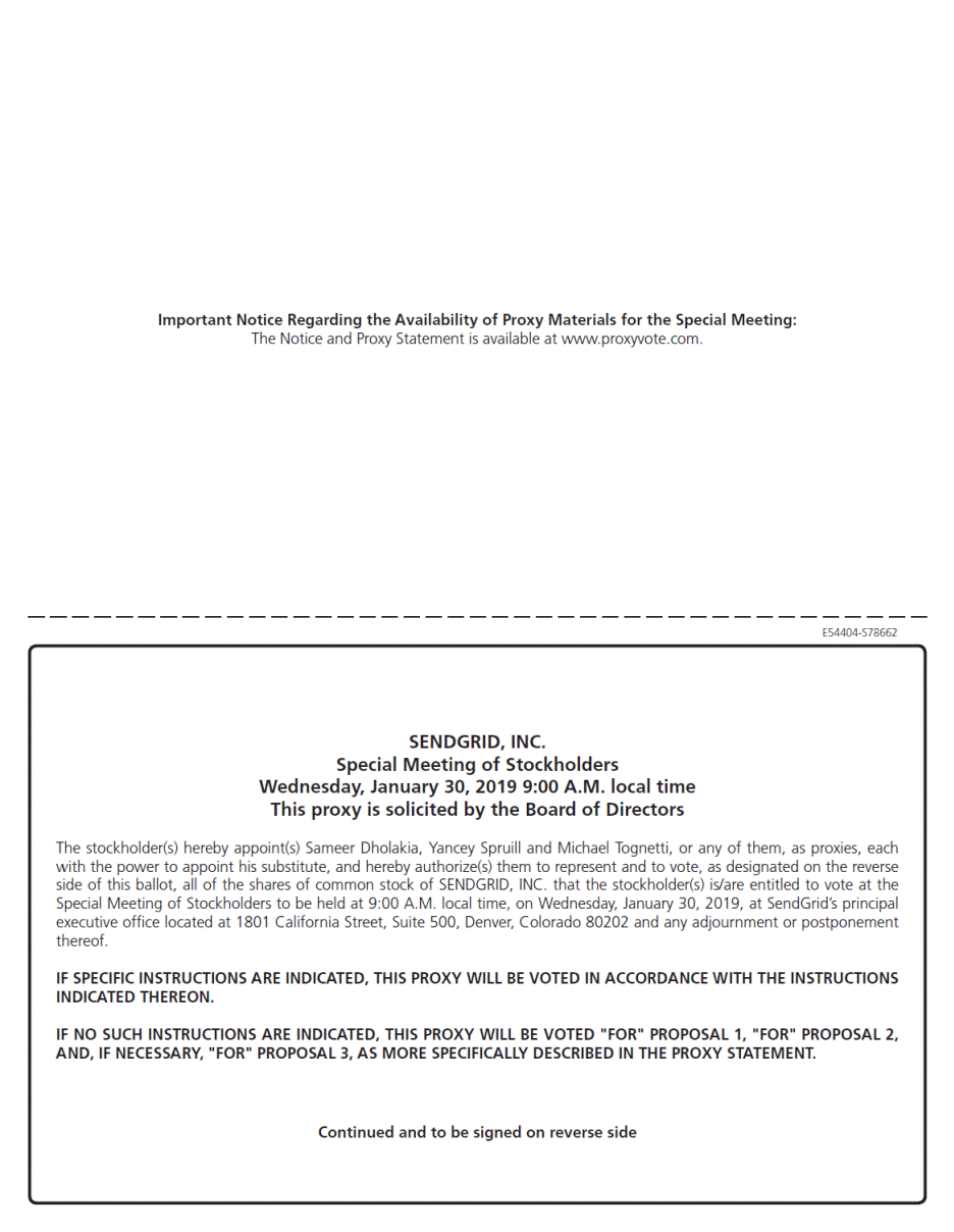Important Notice Regarding the Availability of Proxy Materials for the Special Meeting: The Notice and Proxy Statement is available at www.proxyvote.com. E54404-S78662 SENDGRID, INC. Special Meeting of Stockholders Wednesday, January 30, 2019 9:00 A.M. local time This proxy is solicited by the Board of Directors The stockholder(s) hereby appoint(s) Sameer Dholakia, Yancey Spruill and Michael Tognetti, or any of them, as proxies, each with the power to appoint his substitute, and hereby authorize(s) them to represent and to vote, as designated on the reverse side of this ballot, all of the shares of common stock of SENDGRID, INC. that the stockholder(s) is/are entitled to vote at the Special Meeting of Stockholders to be held at 9:00 A.M. local time, on Wednesday, January 30, 2019, at SendGrid’s principal executive office located at 1801 California Street, Suite 500, Denver, Colorado 80202 and any adjournment or postponement thereof. IF SPECIFIC INSTRUCTIONS ARE INDICATED, THIS PROXY WILL BE VOTED IN ACCORDANCE WITH THE INSTRUCTIONS INDICATED THEREON. IF NO SUCH INSTRUCTIONS ARE INDICATED, THIS PROXY WILL BE VOTED "FOR" PROPOSAL 1, "FOR" PROPOSAL 2, AND, IF NECESSARY, "FOR" PROPOSAL 3, AS MORE SPECIFICALLY DESCRIBED IN THE PROXY STATEMENT. Continued and to be signed on reverse side