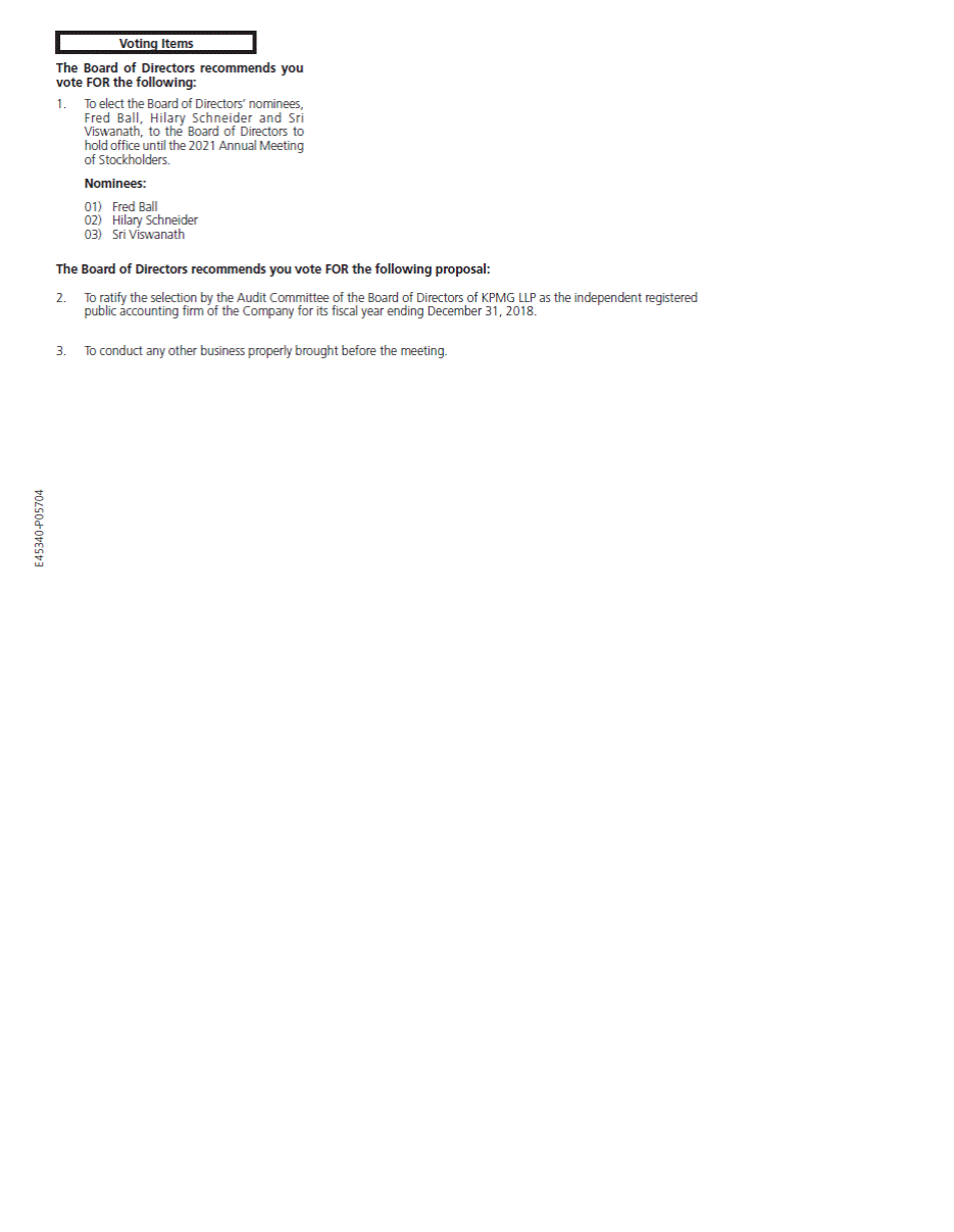 The Board of Directors recommends you vote FOR the following: 1.To elect the Board of Directors’ nominees, Fred Ball, Hilary Schneider and Sri Viswanath, to the Board of Directors to hold office until the 2021 Annual Meeting of Stockholders. Nominees: 01) 02) 03) Fred Ball Hilary Schneider Sri Viswanath The Board of Directors recommends you vote FOR the following proposal: 2.To ratify the selection by the Audit Committee of the Board of Directors of KPMG LLP as the independent registered public accounting firm of the Company for its fiscal year ending December 31, 2018. 3.To conduct any other business properly brought before the meeting. E45340-P05704 Voting Items