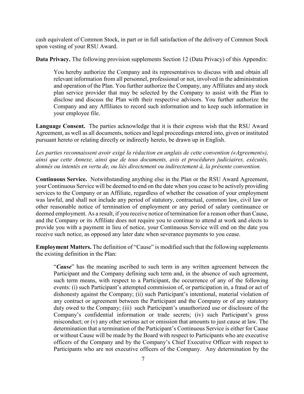 7 cash equivalent of Common Stock, in part or in full satisfaction of the delivery of Common Stock upon vesting of your RSU Award. Data Privacy. The following provision supplements Section 12 (Data Privacy) of this Appendix: You hereby authorize the Company and its representatives to discuss with and obtain all relevant information from all personnel, professional or not, involved in the administration and operation of the Plan. You further authorize the Company, any Affiliates and any stock plan service provider that may be selected by the Company to assist with the Plan to disclose and discuss the Plan with their respective advisors. You further authorize the Company and any Affiliates to record such information and to keep such information in your employee file. Language Consent. The parties acknowledge that it is their express wish that the RSU Award Agreement, as well as all documents, notices and legal proceedings entered into, given or instituted pursuant hereto or relating directly or indirectly hereto, be drawn up in English. Les parties reconnaissent avoir exigé la rédaction en anglais de cette convention («Agreement»), ainsi que cette Annexe, ainsi que de tous documents, avis et procédures judiciaires, exécutés, donnés ou intentés en vertu de, ou liés directement ou indirectement à, la présente convention. Continuous Service. Notwithstanding anything else in the Plan or the RSU Award Agreement, your Continuous Service will be deemed to end on the date when you cease to be actively providing services to the Company or an Affiliate, regardless of whether the cessation of your employment was lawful, and shall not include any period of statutory, contractual, common law, civil law or other reasonable notice of termination of employment or any period of salary continuance or deemed employment. As a result, if you receive notice of termination for a reason other than Cause, and the Company or its Affiliate does not require you to continue to attend at work and elects to provide you with a payment in lieu of notice, your Continuous Service will end on the date you receive such notice, as opposed any later date when severance payments to you cease. Employment Matters. The definition of “Cause” is modified such that the following supplements the existing definition in the Plan: “Cause” has the meaning ascribed to such term in any written agreement between the Participant and the Company defining such term and, in the absence of such agreement, such term means, with respect to a Participant, the occurrence of any of the following events: (i) such Participant’s attempted commission of, or participation in, a fraud or act of dishonesty against the Company; (ii) such Participant’s intentional, material violation of any contract or agreement between the Participant and the Company or of any statutory duty owed to the Company; (iii) such Participant’s unauthorized use or disclosure of the Company’s confidential information or trade secrets; (iv) such Participant’s gross misconduct; or (v) any other serious act or omission that amounts to just cause at law. The determination that a termination of the Participant’s Continuous Service is either for Cause or without Cause will be made by the Board with respect to Participants who are executive officers of the Company and by the Company’s Chief Executive Officer with respect to Participants who are not executive officers of the Company. Any determination by the