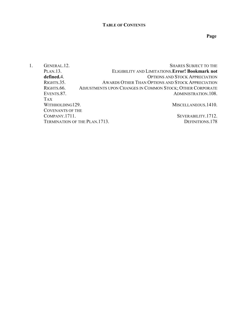 TABLE OF CONTENTS Page 1. GENERAL.12. SHARES SUBJECT TO THE PLAN.13. ELIGIBILITY AND LIMITATIONS.Error! Bookmark not defined.4. OPTIONS AND STOCK APPRECIATION RIGHTS.35. AWARDS OTHER THAN OPTIONS AND STOCK APPRECIATION RIGHTS.66. ADJUSTMENTS UPON CHANGES IN COMMON STOCK; OTHER CORPORATE EVENTS.87. ADMINISTRATION.108. TAX WITHHOLDING129. MISCELLANEOUS.1410. COVENANTS OF THE COMPANY.1711. SEVERABILITY.1712. TERMINATION OF THE PLAN.1713. DEFINITIONS.178