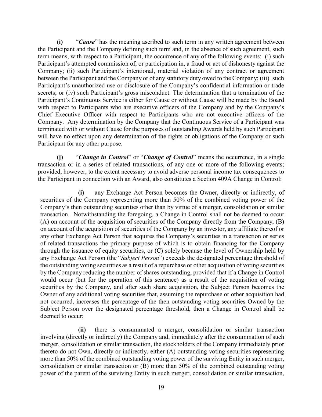 19 (i) “Cause” has the meaning ascribed to such term in any written agreement between the Participant and the Company defining such term and, in the absence of such agreement, such term means, with respect to a Participant, the occurrence of any of the following events: (i) such Participant’s attempted commission of, or participation in, a fraud or act of dishonesty against the Company; (ii) such Participant’s intentional, material violation of any contract or agreement between the Participant and the Company or of any statutory duty owed to the Company; (iii) such Participant’s unauthorized use or disclosure of the Company’s confidential information or trade secrets; or (iv) such Participant’s gross misconduct. The determination that a termination of the Participant’s Continuous Service is either for Cause or without Cause will be made by the Board with respect to Participants who are executive officers of the Company and by the Company’s Chief Executive Officer with respect to Participants who are not executive officers of the Company. Any determination by the Company that the Continuous Service of a Participant was terminated with or without Cause for the purposes of outstanding Awards held by such Participant will have no effect upon any determination of the rights or obligations of the Company or such Participant for any other purpose. (j) “Change in Control” or “Change of Control” means the occurrence, in a single transaction or in a series of related transactions, of any one or more of the following events; provided, however, to the extent necessary to avoid adverse personal income tax consequences to the Participant in connection with an Award, also constitutes a Section 409A Change in Control: (i) any Exchange Act Person becomes the Owner, directly or indirectly, of securities of the Company representing more than 50% of the combined voting power of the Company’s then outstanding securities other than by virtue of a merger, consolidation or similar transaction. Notwithstanding the foregoing, a Change in Control shall not be deemed to occur (A) on account of the acquisition of securities of the Company directly from the Company, (B) on account of the acquisition of securities of the Company by an investor, any affiliate thereof or any other Exchange Act Person that acquires the Company’s securities in a transaction or series of related transactions the primary purpose of which is to obtain financing for the Company through the issuance of equity securities, or (C) solely because the level of Ownership held by any Exchange Act Person (the “Subject Person”) exceeds the designated percentage threshold of the outstanding voting securities as a result of a repurchase or other acquisition of voting securities by the Company reducing the number of shares outstanding, provided that if a Change in Control would occur (but for the operation of this sentence) as a result of the acquisition of voting securities by the Company, and after such share acquisition, the Subject Person becomes the Owner of any additional voting securities that, assuming the repurchase or other acquisition had not occurred, increases the percentage of the then outstanding voting securities Owned by the Subject Person over the designated percentage threshold, then a Change in Control shall be deemed to occur; (ii) there is consummated a merger, consolidation or similar transaction involving (directly or indirectly) the Company and, immediately after the consummation of such merger, consolidation or similar transaction, the stockholders of the Company immediately prior thereto do not Own, directly or indirectly, either (A) outstanding voting securities representing more than 50% of the combined outstanding voting power of the surviving Entity in such merger, consolidation or similar transaction or (B) more than 50% of the combined outstanding voting power of the parent of the surviving Entity in such merger, consolidation or similar transaction,