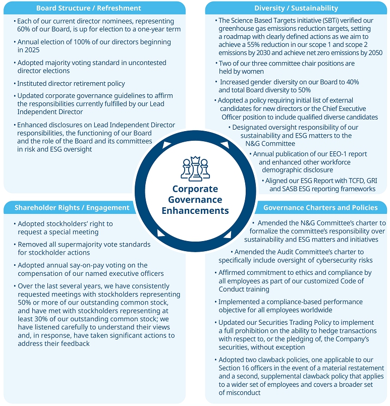 | • | Continued declassification of the Board: 60% of our directors are up for election to one-year terms in 2024 and 100% of our directors will be up for election to one-year terms in 2025 |