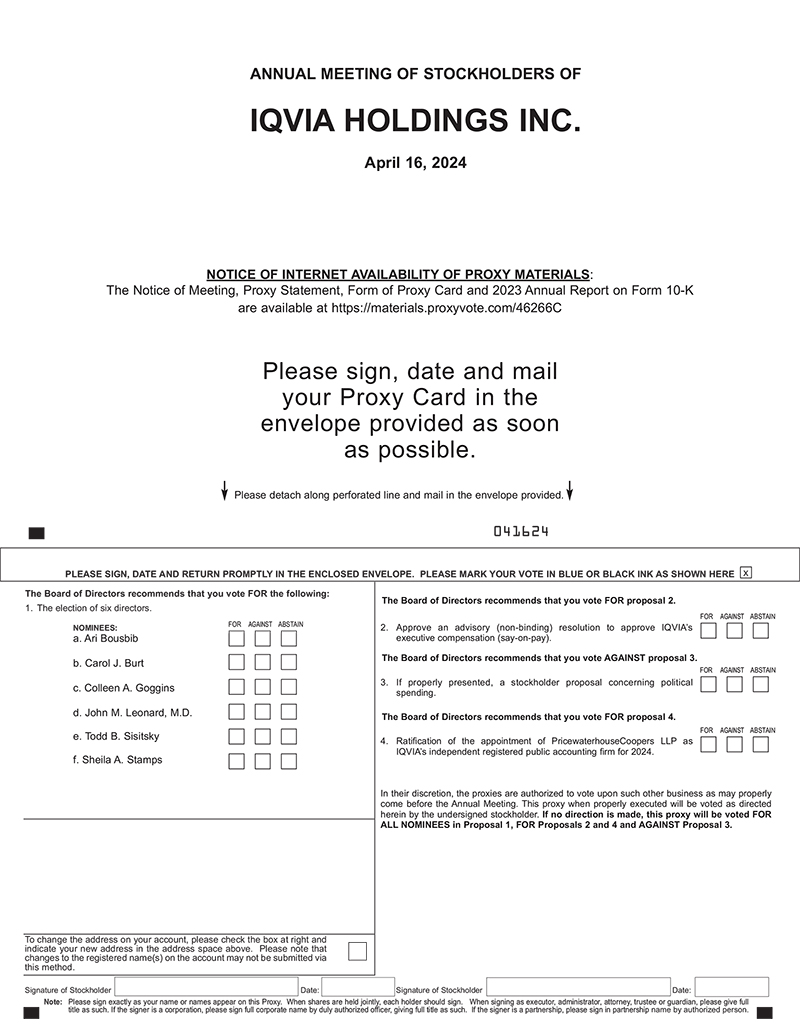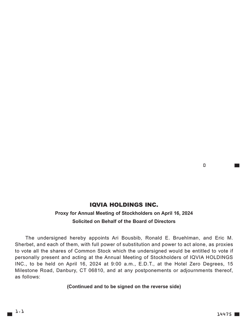 You are cordially invited to attend the 2024 Annual Meeting of Stockholders of IQVIA Holdings Inc. (2024 Annual Meeting) on Tuesday, April 16, 2024, at 9:00 a.m. E.D.T. at the Hotel Zero Degrees, 15 Milestone Road, Danbury, Connecticut. This Notice of Meeting, and the Proxy Statement accompanying this letter, describes the business to be conducted at the 2024 Annual Meeting and provides further information about IQVIA.