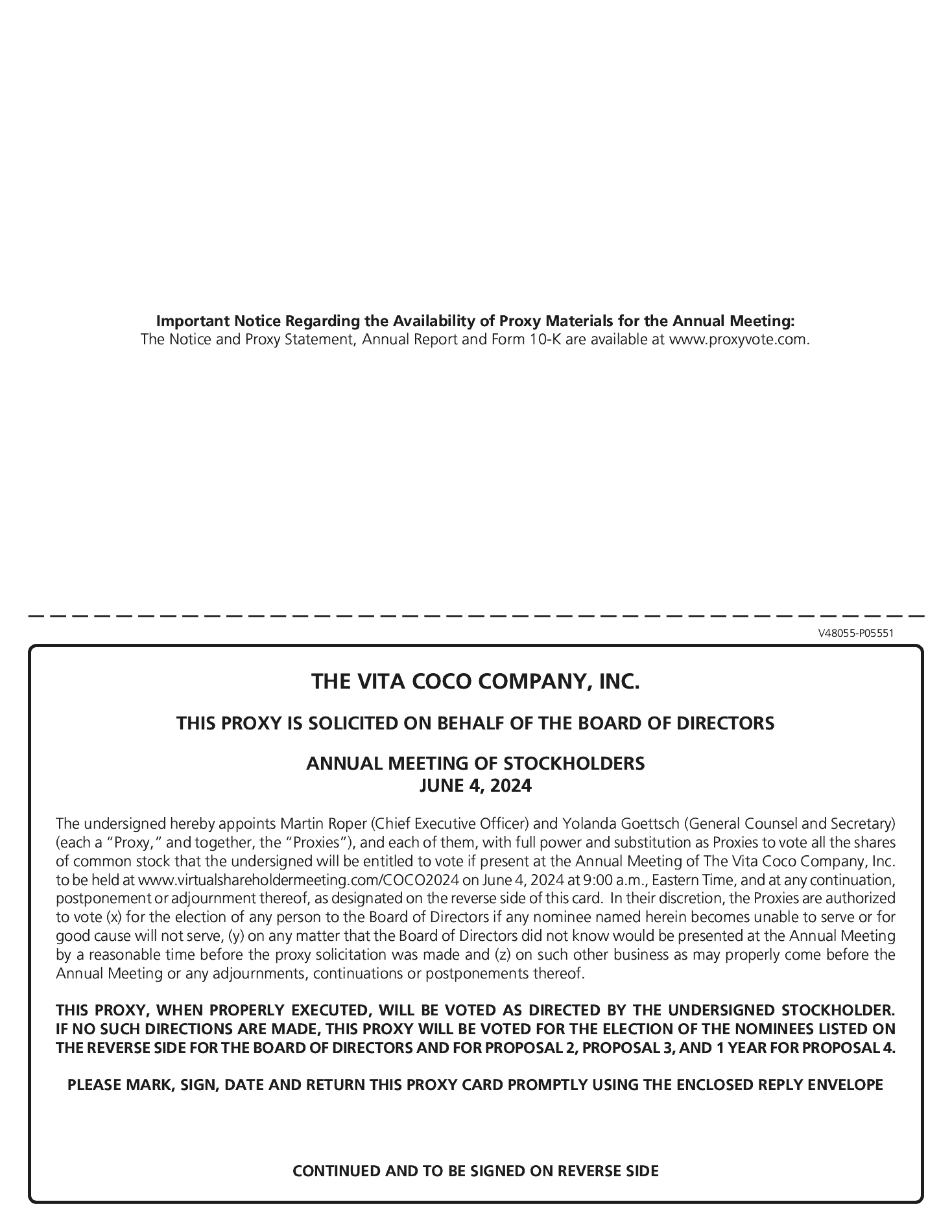 Why hold a virtual meeting? | | | As part of our effort to increase accessibility and provide an efficient way for our stockholders to attend the Annual Meeting, we believe that hosting a virtual meeting this year is in the best interest of the Company and its stockholders. A virtual meeting also enables increased stockholder attendance and participation because stockholders can participate from any location around the world. You will be able to attend the Annual Meeting online and submit your questions by visiting www.virtualshareholdermeeting.com/COCO2024. You also will be able to vote your shares electronically at the Annual Meeting by following the instructions above. The virtual meeting platform is supported across up-to-date internet browsers and devices (e.g., desktops, laptops, tablets, and cell phones). If you intend to join the live webcast, you should ensure that you have a strong Wi-Fi or internet connection. In the event technical issues or other events delay or disrupt our ability to convene the Annual Meeting for longer than 30 minutes, we will make an announcement on the “Investor Relations” section of our corporate website at https://investors.thevitacococompany.com/, regarding a date, time and place for reconvening the Annual Meeting. In the event of disorder, technical malfunction or other significant problem that disrupts the Annual Meeting, the chair of the meeting may adjourn, recess, or expedite the Annual Meeting, or take such other action as the chair of the meeting determines is appropriate in light of the circumstances. |