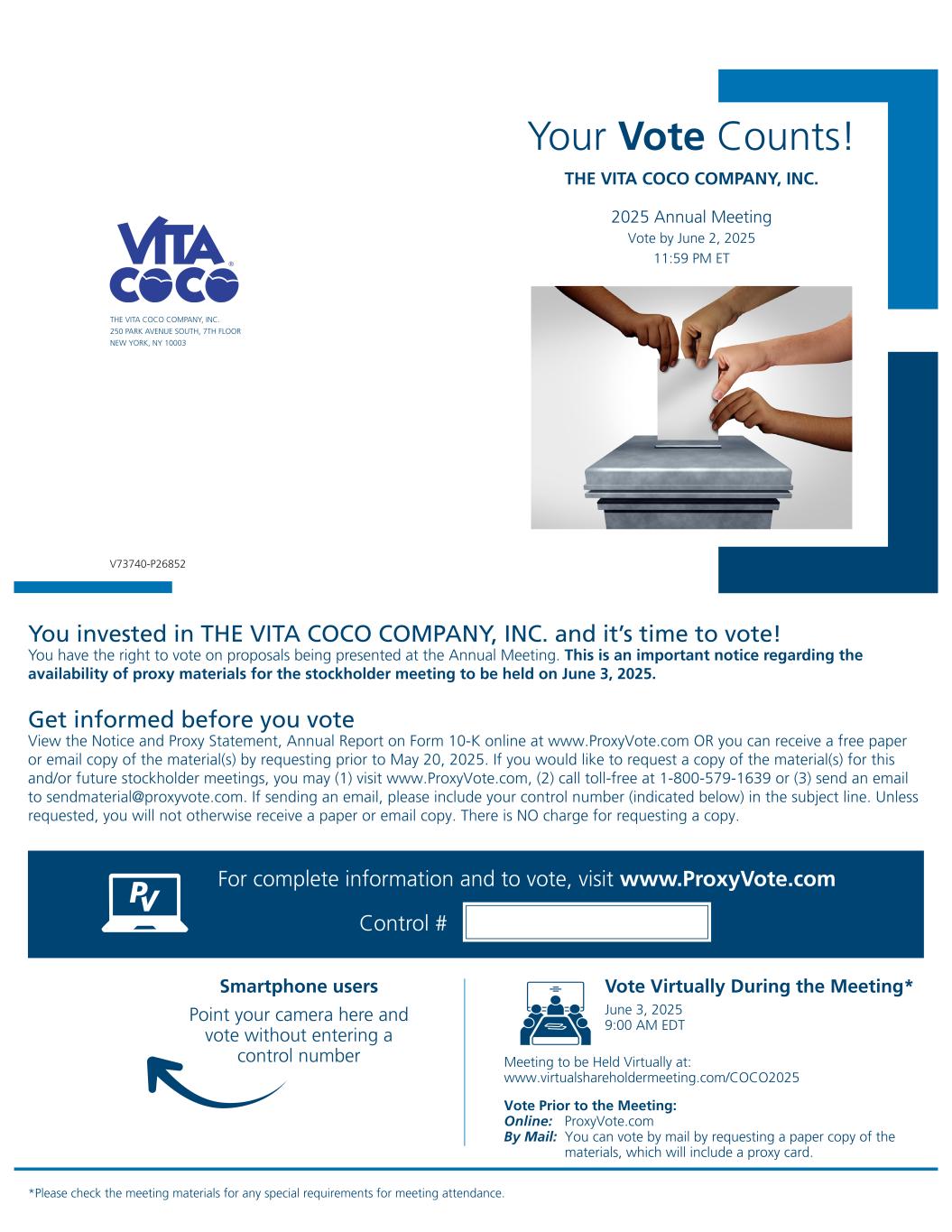 Your Vote Counts! *Please check the meeting materials for any special requirements for meeting attendance. Smartphone users Point your camera here and vote without entering a control number For complete information and to vote, visit www.ProxyVote.com Control # V73740-P26852 THE VITA COCO COMPANY, INC. 250 PARK AVENUE SOUTH, 7TH FLOOR NEW YORK, NY 10003 THE VITA COCO COMPANY, INC. 2025 Annual Meeting Vote by June 2, 2025 11:59 PM ET You invested in THE VITA COCO COMPANY, INC. and it’s time to vote! You have the right to vote on proposals being presented at the Annual Meeting. This is an important notice regarding the availability of proxy materials for the stockholder meeting to be held on June 3, 2025. Vote Virtually During the Meeting* June 3, 2025 9:00 AM EDT Get informed before you vote View the Notice and Proxy Statement, Annual Report on Form 10-K online at www.ProxyVote.com OR you can receive a free paper or email copy of the material(s) by requesting prior to May 20, 2025. If you would like to request a copy of the material(s) for this and/or future stockholder meetings, you may (1) visit www.ProxyVote.com, (2) call toll-free at 1-800-579-1639 or (3) send an email to sendmaterial@proxyvote.com. If sending an email, please include your control number (indicated below) in the subject line. Unless requested, you will not otherwise receive a paper or email copy. There is NO charge for requesting a copy. Meeting to be Held Virtually at: www.virtualshareholdermeeting.com/COCO2025 Vote Prior to the Meeting: Online: ProxyVote.com By Mail: You can vote by mail by requesting a paper copy of the materials, which will include a proxy card.
