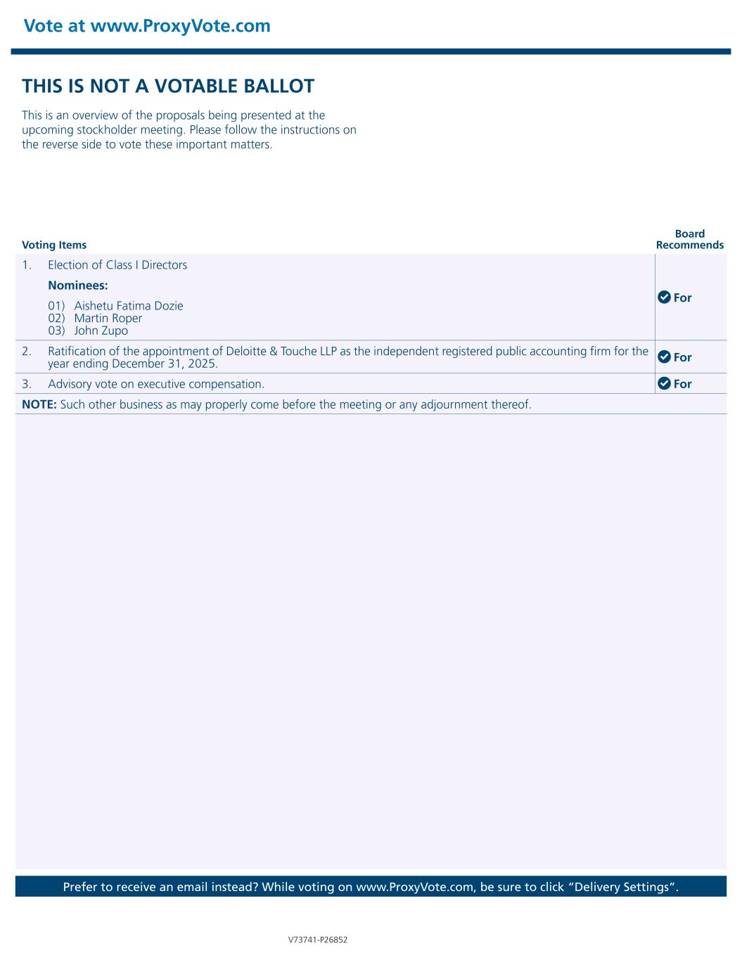 Vote at www.ProxyVote.com Prefer to receive an email instead? While voting on www.ProxyVote.com, be sure to click “Delivery Settings”. Voting Items Board Recommends V73741-P26852 THIS IS NOT A VOTABLE BALLOT This is an overview of the proposals being presented at the upcoming stockholder meeting. Please follow the instructions on the reverse side to vote these important matters. 1. Election of Class I Directors For Nominees: 01) Aishetu Fatima Dozie 02) Martin Roper 03) John Zupo 2. Ratification of the appointment of Deloitte & Touche LLP as the independent registered public accounting firm for the year ending December 31, 2025. For 3. Advisory vote on executive compensation. For NOTE: Such other business as may properly come before the meeting or any adjournment thereof.