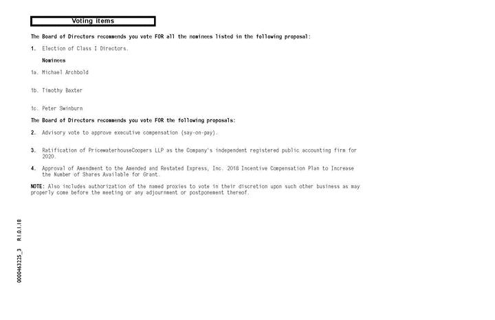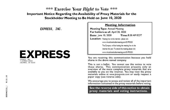 See the reverse side of this notice to obtain proxy materials and voting instructions. *** Exercise Your Right to Vote *** Important Notice Regarding the Availability of Proxy Materials for the Stockholder Meeting to Be Held on <mtgdate>. You are receiving this communication because you hold shares in the above named company. This is not a ballot. You cannot use this notice to vote these shares. This communication presents only an overview of the more complete proxy materials that are available to you on the Internet. You may view the proxy materials online at www.proxyvote.com or easily request a paper copy (see reverse side). We encourage you to access and review all of the important information contained in the proxy materials before voting. Meeting Information Meeting Type: <mtgtype> For holders as of: <recdate> Date: Time: <mtgtime> Location: 0000463225_1 R1.0.1.18 EXPRESS, INC. EXPRESS, INC. 1 EXPRESS DRIVE COLUMBUS, OH 43230 Annual Meeting April 20, 2020 June 10, 2020 June 10, 2020 8:30 AM EDT Meeting live via the internet - please visit www.virtualshareholdermeeting.com/EXPR2020 The Company will be hosting the meeting live via the internet this year. To attend the meeting please visit www.virtualshareholdermeeting.com/EXPR2020.