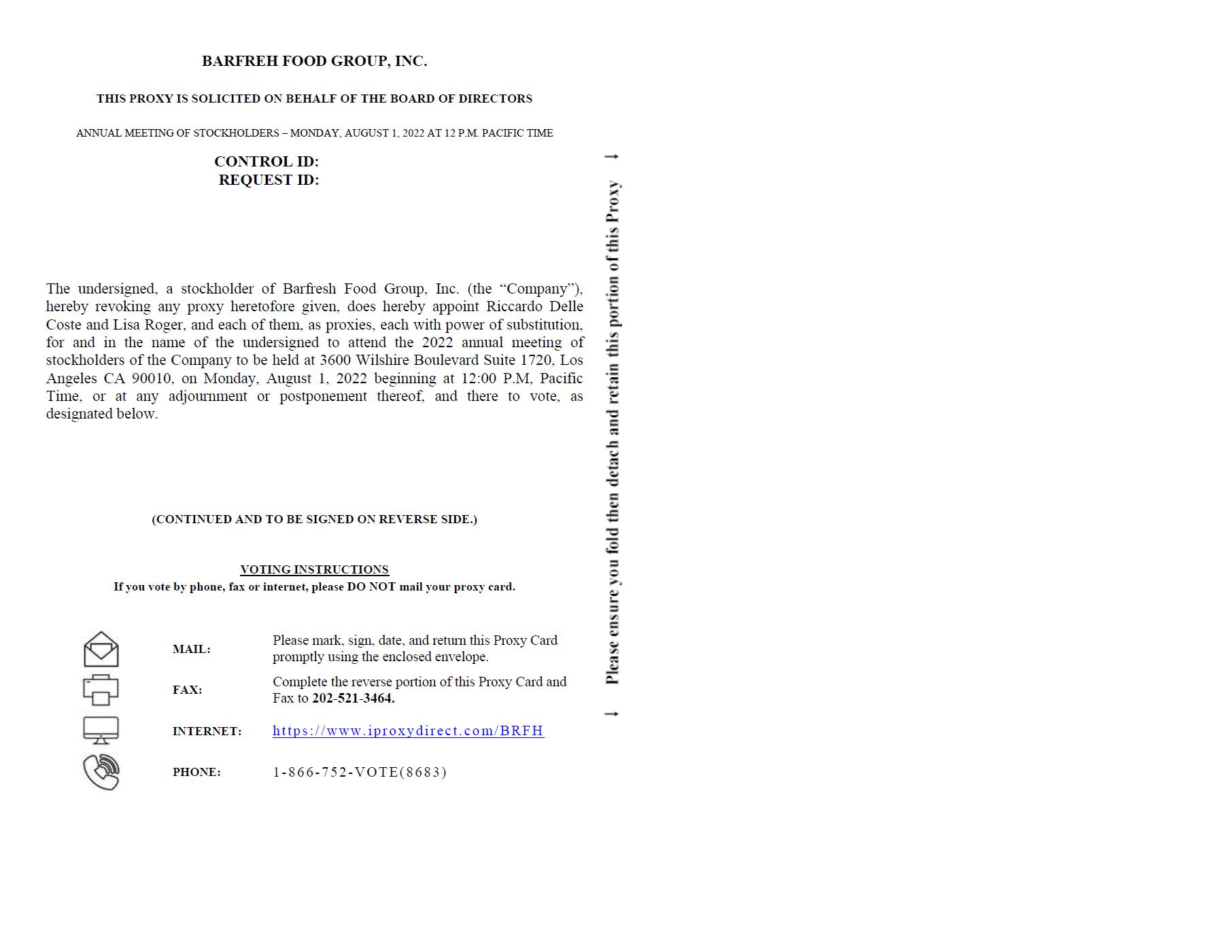 Notice is hereby given that the 2022 Annual Meeting of Stockholders of Barfresh Food Group Inc. (“we”, “us”, “Barfresh” or the “Company”), will be held at 12:00 p.m. Pacific Standard Time, on Monday, August 1, 2022 at our principal executive office, 3600 Wilshire Boulevard Suite 1720, Los Angeles, CA 90010, to conduct the following items of business: