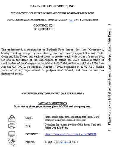 Notice is hereby given that the 2022 Annual Meeting of Stockholders of Barfresh Food Group Inc. (“we”, “us”, “Barfresh” or the “Company”), will be held at 12:00 p.m. Pacific Standard Time, on Monday, August 1, 2022 at our principal executive office, 3600 Wilshire Boulevard Suite 1720, Los Angeles, CA 90010, to conduct the following items of business:
