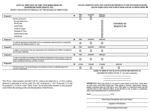 All holders of record of our common stock as of the close of business on July 1, 2022, the record date, are entitled to notice of and to vote at this meeting and any adjournments or postponement thereof. A list of stockholders entitled to vote at the Annual Meeting will be available for inspection during the ten days prior to the Annual Meeting, during ordinary business hours, at Barfresh’s principal executive office as well as at the Annual Meeting.
