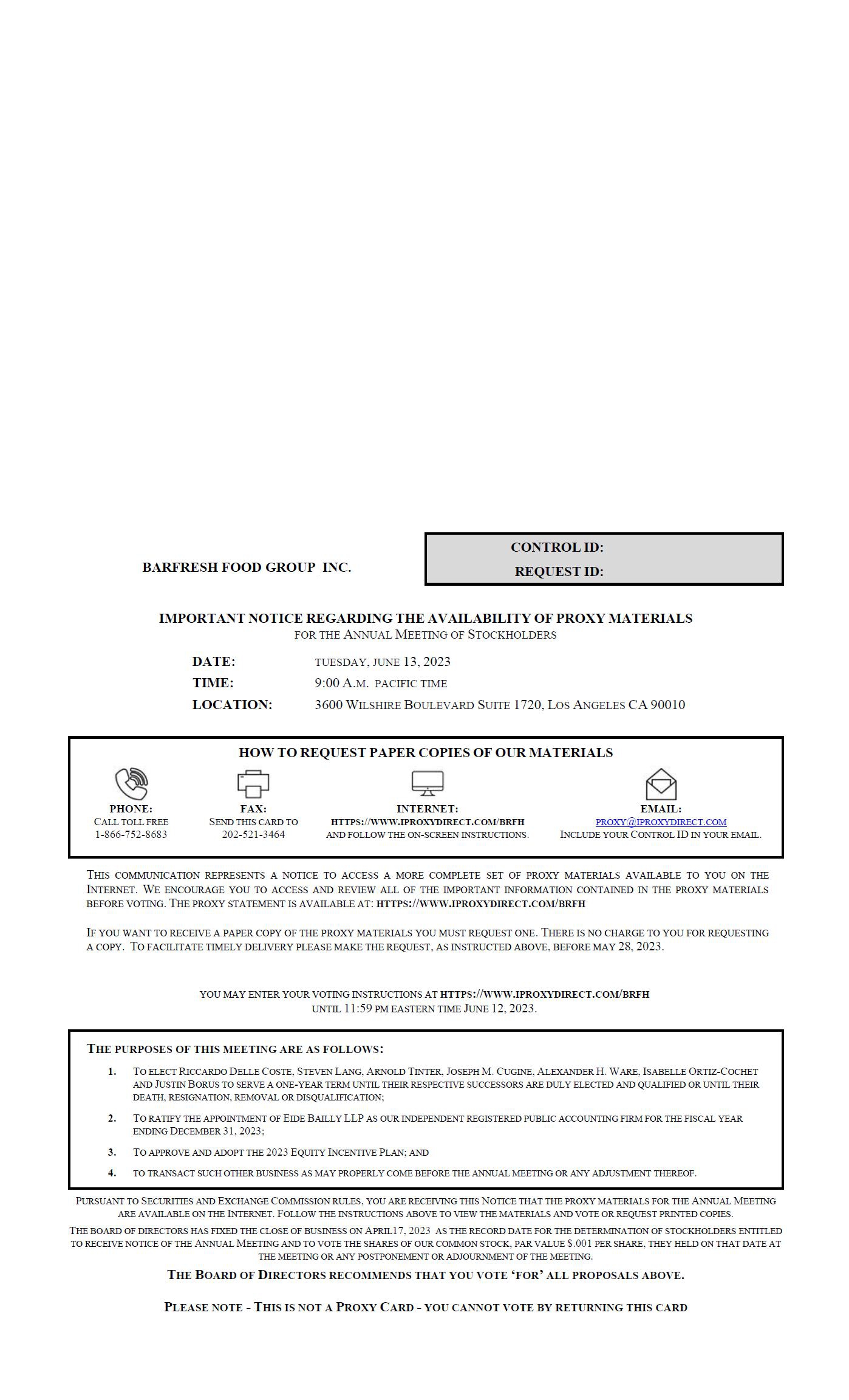 Notice is hereby given that the 2023 Annual Meeting of Stockholders (the “Annual Meeting”) of Barfresh Food Group Inc. (“we”, “us”, “Barfresh” or the “Company”), will be held at 9:00 a.m. Pacific Daylight Time, on Tuesday, June 13, 2023 at our principal executive office, 3600 Wilshire Boulevard Suite 1720, Los Angeles, CA 90010, to conduct the following items of business: