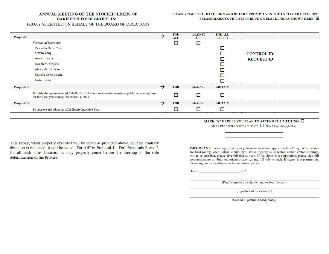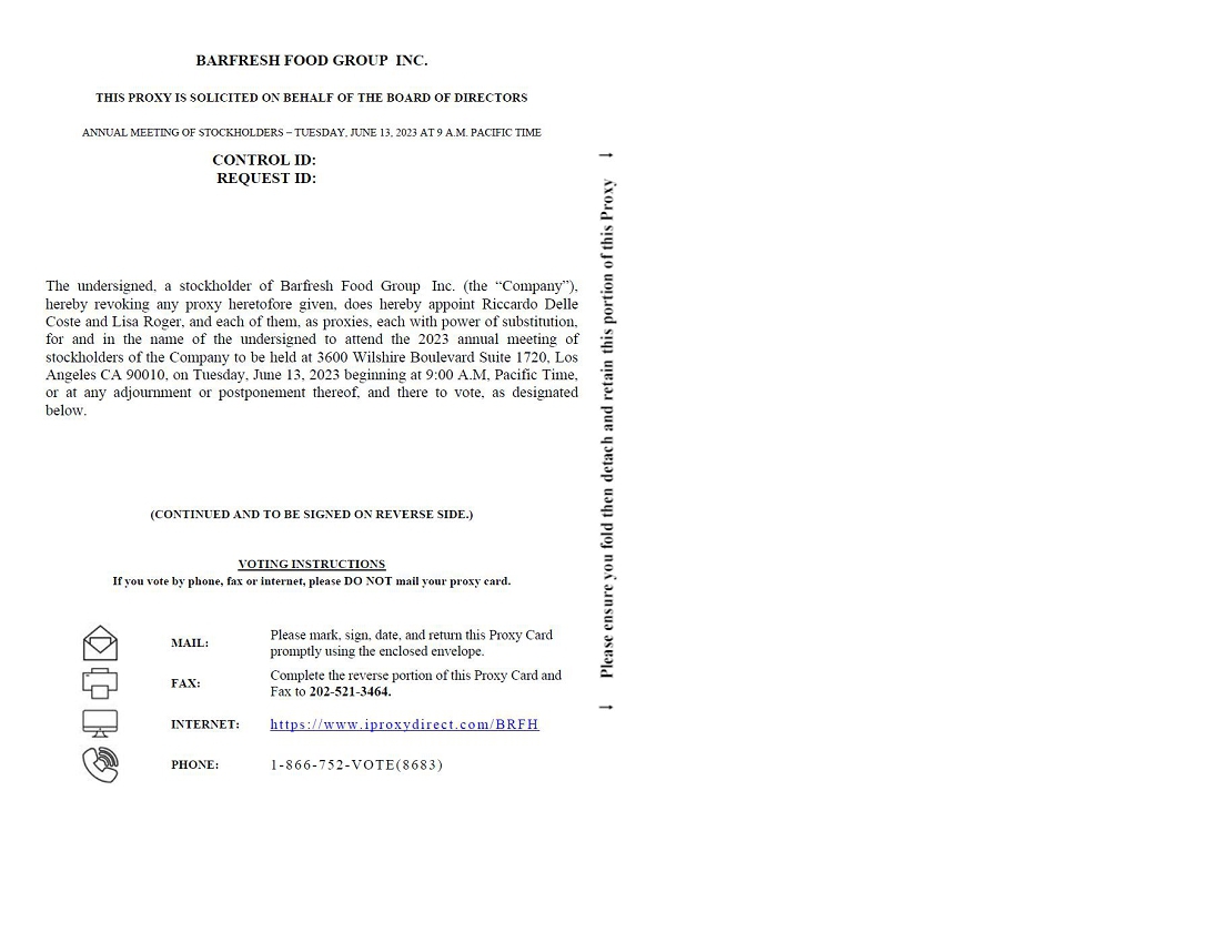Notice is hereby given that the 2023 Annual Meeting of Stockholders (the “Annual Meeting”) of Barfresh Food Group Inc. (“we”, “us”, “Barfresh” or the “Company”), will be held at 9:00 a.m. Pacific Daylight Time, on Tuesday, June 13, 2023 at our principal executive office, 3600 Wilshire Boulevard Suite 1720, Los Angeles, CA 90010, to conduct the following items of business: