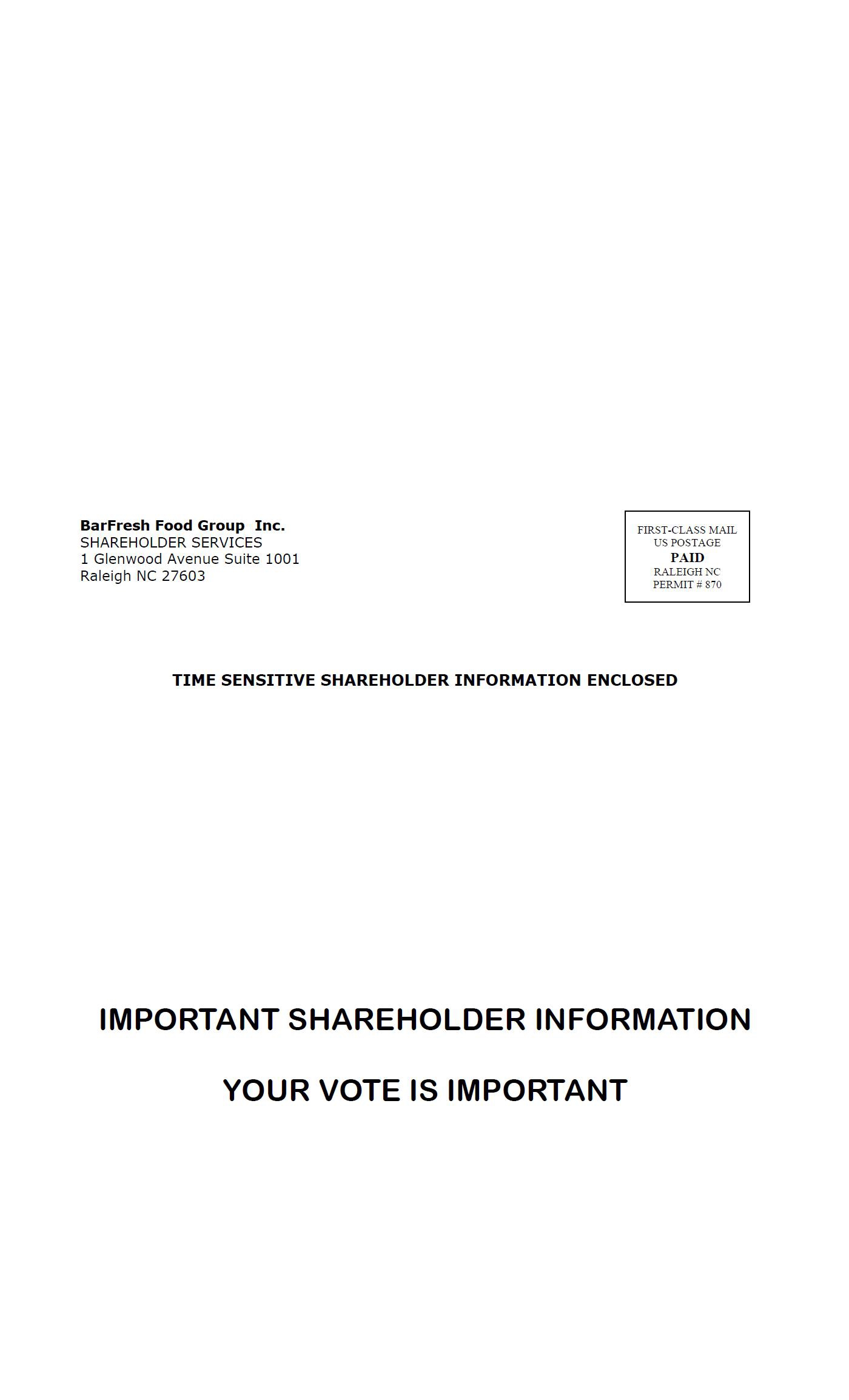 Who will pay for the costs involved in the solicitation of proxies? This Proxy Statement is furnished in connection with the solicitation of proxies by the board of directors of Barfresh Food Group Inc. Barfresh will pay all costs of preparing, assembling, printing and distributing the Proxy Materials. Our employees, officers and directors may, for no additional compensation, solicit proxies on behalf of the board of directors through the mail, in person and by telecommunications. Upon request, we will reimburse brokerage firms and other record holders for their reasonable expenses incurred for forwarding solicitation material to beneficial owners of stock.