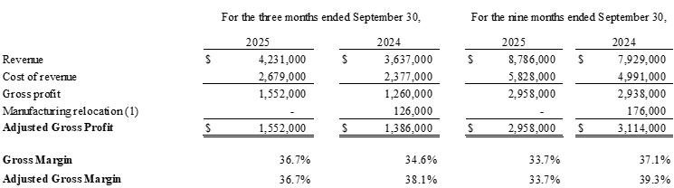 Gross margin for the first nine months of 2025 was 34%, compared to 37% for the same period of 2024. The decrease in gross margin is a result of product mix and new manufacturer trial and development costs. Adjusted gross margin for the first nine months of 2024 was 39%. A reconciliation of Gross Profit to Adjusted Gross Profit is provided below.