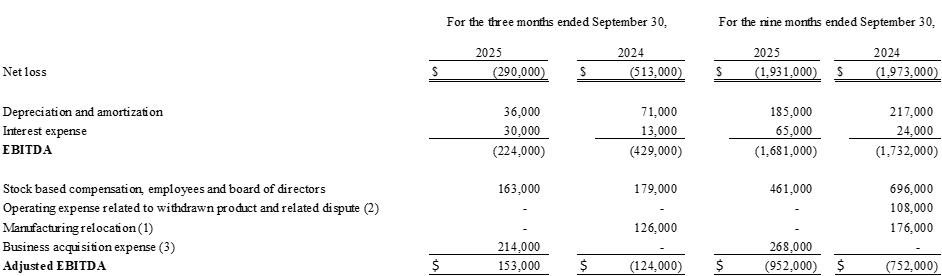 Adjusted EBITDA was approximately a loss of $952,000 for the first nine months of 2025, as compared to a loss of $752,000 in the same period of 2024. A reconciliation of net loss to Adjusted EBITDA is provided below.
