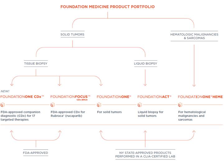 As a precursor to the FDA approval of FoundationOne CDx, in December 2016, we received FDA approval for, and began commercialization of, FoundationFocus CDx BRCA, a companion diagnostic assay to aid in identifying women with ovarian cancer for whom treatment with Rubraca™ (rucaparib), a therapy offered by Clovis Oncology, Inc., or Clovis, is being considered. This companion diagnostic claim is now included on FoundationOne CDx. We believe the experience of gaining FDA approval for FoundationFocus CDx BRCA was instrumental in our FDA approval for FoundationOne CDx.
