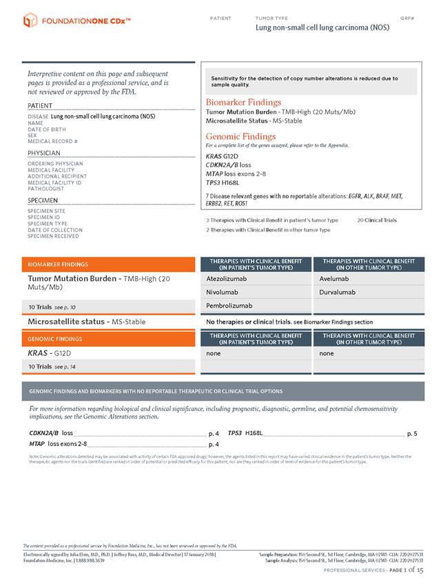 At the time of its approval, FoundationOne CDx guided to 17 targeted therapies across five of the most common solid tumors: NSCLC, CRC, ovarian cancer, breast cancer, and melanoma. FoundationOne CDx also reports predictive genomic signatures for immuno-oncology treatment selection including microsatellite instability (MSI) and tumor mutational burden (TMB). We intend to update FoundationOne CDx over time with new FDA-approved companion diagnostic claims. As such, we believe FoundationOne CDx enables the practice of precision oncology by identifying more patients who may benefit from targeted treatment, immunotherapy approaches, and clinical trials than traditional single gene testing methods.