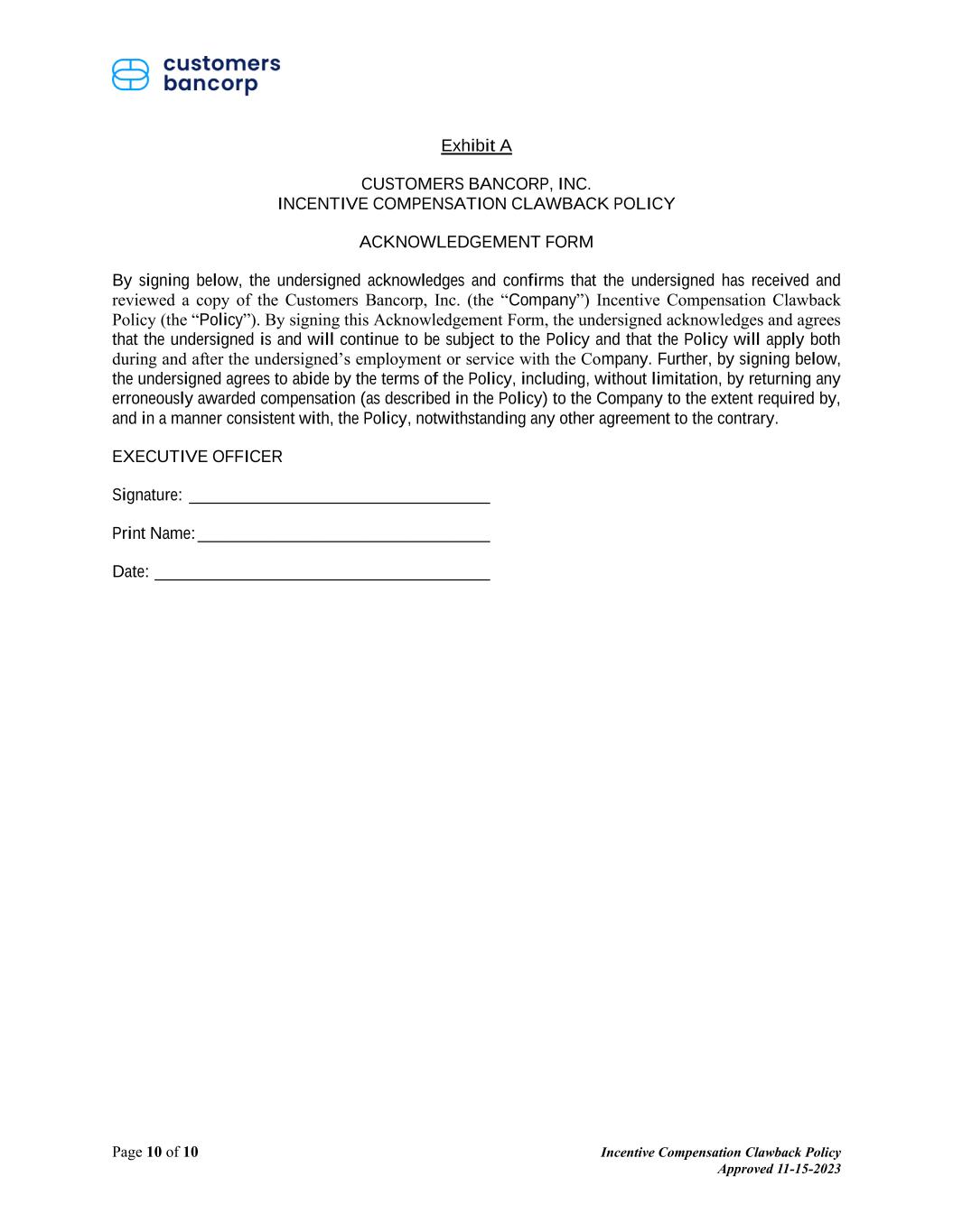 Page 10 of 10 Incentive Compensation Clawback Policy Approved 11-15-2023 Exhibit A CUSTOMERS BANCORP, INC. INCENTIVE COMPENSATION CLAWBACK POLICY ACKNOWLEDGEMENT FORM By signing below, the undersigned acknowledges and confirms that the undersigned has received and reviewed a copy of the Customers Bancorp, Inc. (the “Company”) Incentive Compensation Clawback Policy (the “Policy”). By signing this Acknowledgement Form, the undersigned acknowledges and agrees that the undersigned is and will continue to be subject to the Policy and that the Policy will apply both during and after the undersigned’s employment or service with the Company. Further, by signing below, the undersigned agrees to abide by the terms of the Policy, including, without limitation, by returning any erroneously awarded compensation (as described in the Policy) to the Company to the extent required by, and in a manner consistent with, the Policy, notwithstanding any other agreement to the contrary. EXECUTIVE OFFICER Signature: ___________________________________ Print Name: __________________________________ Date: _______________________________________