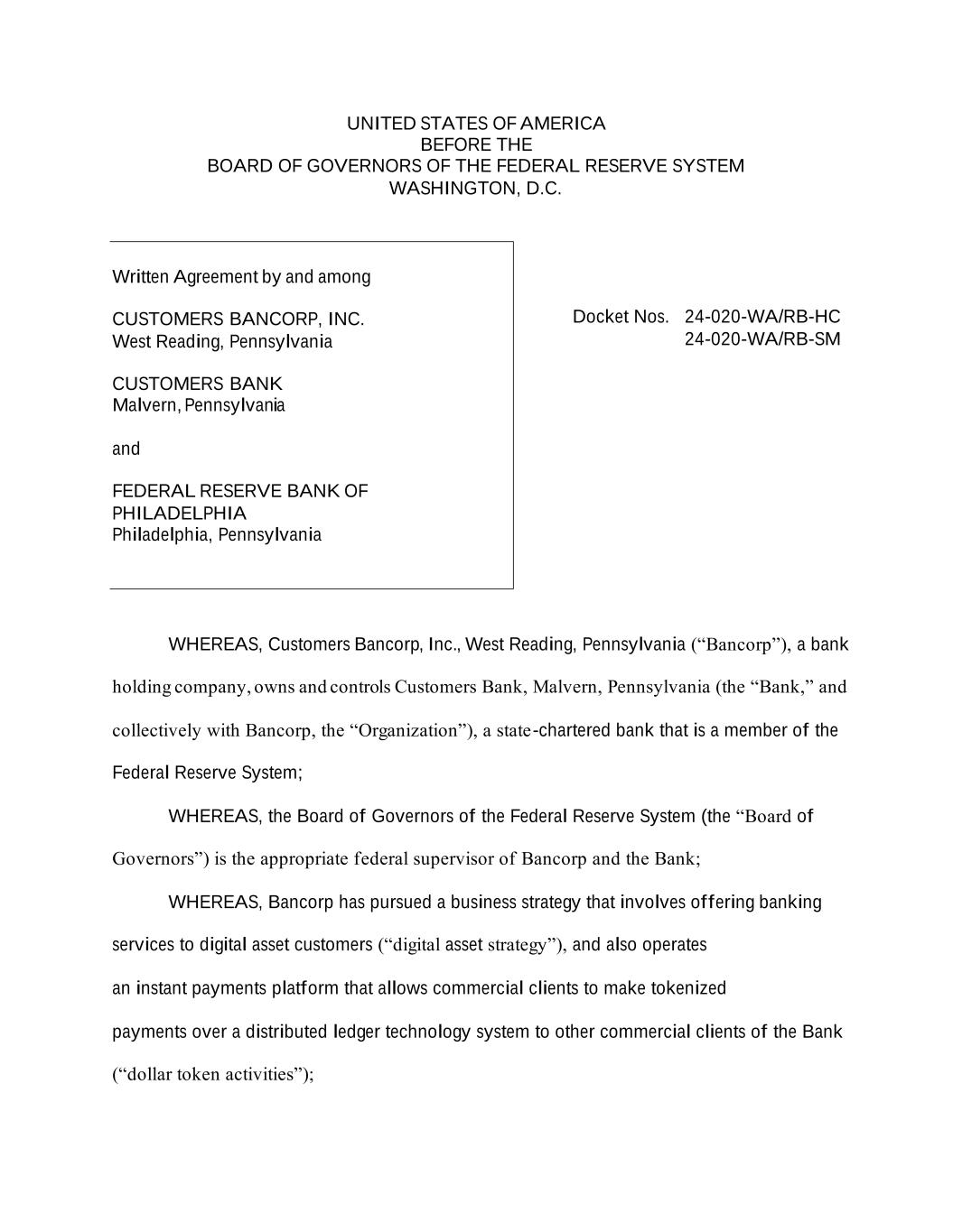 UNITED STATES OF AMERICA BEFORE THE BOARD OF GOVERNORS OF THE FEDERAL RESERVE SYSTEM WASHINGTON, D.C. Docket Nos. 24-020-WA/RB-HC 24-020-WA/RB-SM WHEREAS, Customers Bancorp, Inc., West Reading, Pennsylvania (“Bancorp”), a bank holding company, owns and controls Customers Bank, Malvern, Pennsylvania (the “Bank,” and collectively with Bancorp, the “Organization”), a state-chartered bank that is a member of the Federal Reserve System; WHEREAS, the Board of Governors of the Federal Reserve System (the “Board of Governors”) is the appropriate federal supervisor of Bancorp and the Bank; WHEREAS, Bancorp has pursued a business strategy that involves offering banking services to digital asset customers (“digital asset strategy”), and also operates an instant payments platform that allows commercial clients to make tokenized payments over a distributed ledger technology system to other commercial clients of the Bank (“dollar token activities”); Written Agreement by and among CUSTOMERS BANCORP, INC. West Reading, Pennsylvania CUSTOMERS BANK Malvern, Pennsylvania and FEDERAL RESERVE BANK OF PHILADELPHIA Philadelphia, Pennsylvania