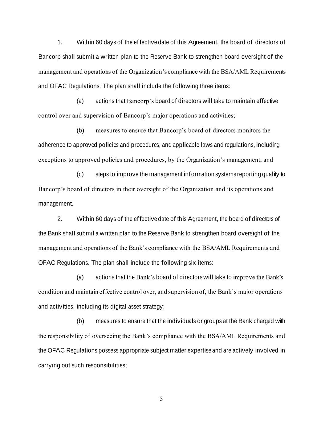 3 1. Within 60 days of the effective date of this Agreement, the board of directors of Bancorp shall submit a written plan to the Reserve Bank to strengthen board oversight of the management and operations of the Organization’s compliance with the BSA/AML Requirements and OFAC Regulations. The plan shall include the following three items: (a) actions that Bancorp’s board of directors will take to maintain effective control over and supervision of Bancorp’s major operations and activities; (b) measures to ensure that Bancorp’s board of directors monitors the adherence to approved policies and procedures, and applicable laws and regulations, including exceptions to approved policies and procedures, by the Organization’s management; and (c) steps to improve the management information systems reporting quality to Bancorp’s board of directors in their oversight of the Organization and its operations and management. 2. Within 60 days of the effective date of this Agreement, the board of directors of the Bank shall submit a written plan to the Reserve Bank to strengthen board oversight of the management and operations of the Bank’s compliance with the BSA/AML Requirements and OFAC Regulations. The plan shall include the following six items: (a) actions that the Bank’s board of directors will take to improve the Bank’s condition and maintain effective control over, and supervision of, the Bank’s major operations and activities, including its digital asset strategy; (b) measures to ensure that the individuals or groups at the Bank charged with the responsibility of overseeing the Bank’s compliance with the BSA/AML Requirements and the OFAC Regulations possess appropriate subject matter expertise and are actively involved in carrying out such responsibilities;