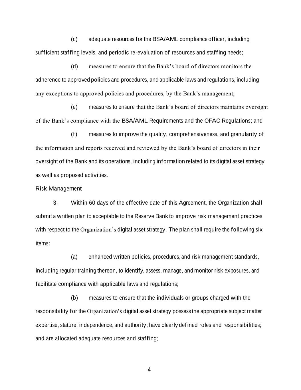 4 (c) adequate resources for the BSA/AML compliance officer, including sufficient staffing levels, and periodic re-evaluation of resources and staffing needs; (d) measures to ensure that the Bank’s board of directors monitors the adherence to approved policies and procedures, and applicable laws and regulations, including any exceptions to approved policies and procedures, by the Bank’s management; (e) measures to ensure that the Bank’s board of directors maintains oversight of the Bank’s compliance with the BSA/AML Requirements and the OFAC Regulations; and (f) measures to improve the quality, comprehensiveness, and granularity of the information and reports received and reviewed by the Bank’s board of directors in their oversight of the Bank and its operations, including information related to its digital asset strategy as well as proposed activities. Risk Management 3. Within 60 days of the effective date of this Agreement, the Organization shall submit a written plan to acceptable to the Reserve Bank to improve risk management practices with respect to the Organization’s digital asset strategy. The plan shall require the following six items: (a) enhanced written policies, procedures, and risk management standards, including regular training thereon, to identify, assess, manage, and monitor risk exposures, and facilitate compliance with applicable laws and regulations; (b) measures to ensure that the individuals or groups charged with the responsibility for the Organization’s digital asset strategy possess the appropriate subject matter expertise, stature, independence, and authority; have clearly defined roles and responsibilities; and are allocated adequate resources and staffing;