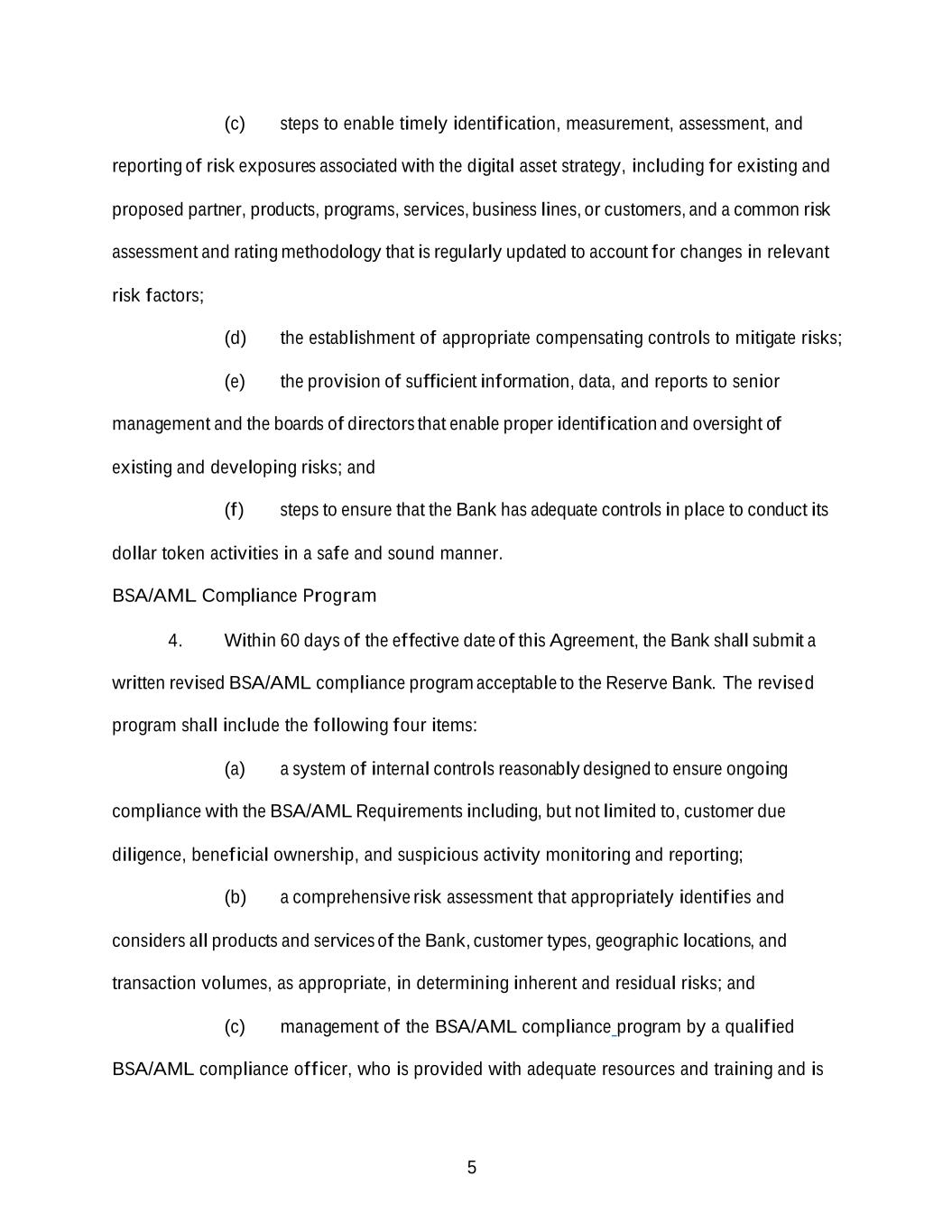 5 (c) steps to enable timely identification, measurement, assessment, and reporting of risk exposures associated with the digital asset strategy, including for existing and proposed partner, products, programs, services, business lines, or customers, and a common risk assessment and rating methodology that is regularly updated to account for changes in relevant risk factors; (d) the establishment of appropriate compensating controls to mitigate risks; (e) the provision of sufficient information, data, and reports to senior management and the boards of directors that enable proper identification and oversight of existing and developing risks; and (f) steps to ensure that the Bank has adequate controls in place to conduct its dollar token activities in a safe and sound manner. BSA/AML Compliance Program 4. Within 60 days of the effective date of this Agreement, the Bank shall submit a written revised BSA/AML compliance program acceptable to the Reserve Bank. The revised program shall include the following four items: (a) a system of internal controls reasonably designed to ensure ongoing compliance with the BSA/AML Requirements including, but not limited to, customer due diligence, beneficial ownership, and suspicious activity monitoring and reporting; (b) a comprehensive risk assessment that appropriately identifies and considers all products and services of the Bank, customer types, geographic locations, and transaction volumes, as appropriate, in determining inherent and residual risks; and (c) management of the BSA/AML compliance program by a qualified BSA/AML compliance officer, who is provided with adequate resources and training and is