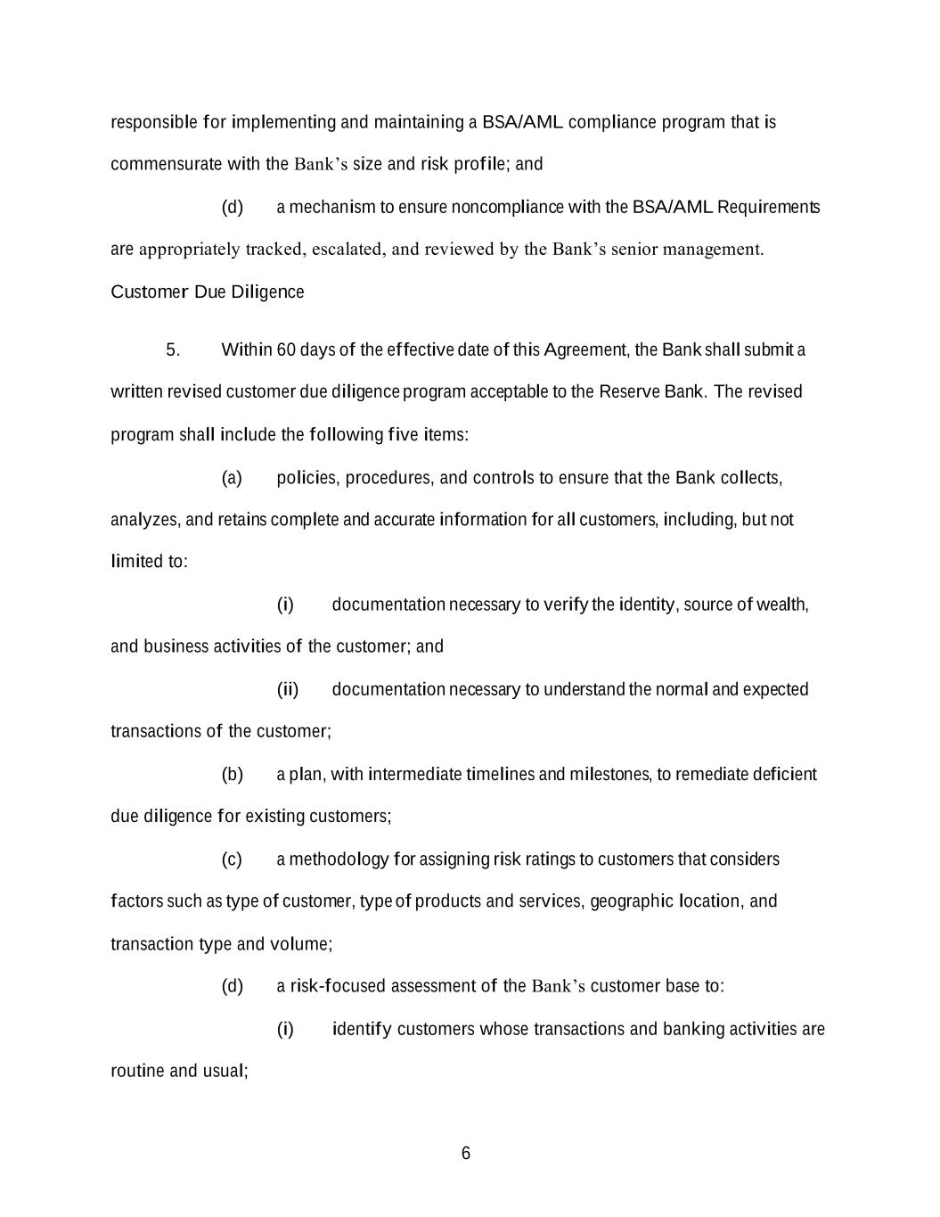 6 responsible for implementing and maintaining a BSA/AML compliance program that is commensurate with the Bank’s size and risk profile; and (d) a mechanism to ensure noncompliance with the BSA/AML Requirements are appropriately tracked, escalated, and reviewed by the Bank’s senior management. Customer Due Diligence 5. Within 60 days of the effective date of this Agreement, the Bank shall submit a written revised customer due diligence program acceptable to the Reserve Bank. The revised program shall include the following five items: (a) policies, procedures, and controls to ensure that the Bank collects, analyzes, and retains complete and accurate information for all customers, including, but not limited to: (i) documentation necessary to verify the identity, source of wealth, and business activities of the customer; and (ii) documentation necessary to understand the normal and expected transactions of the customer; (b) a plan, with intermediate timelines and milestones, to remediate deficient due diligence for existing customers; (c) a methodology for assigning risk ratings to customers that considers factors such as type of customer, type of products and services, geographic location, and transaction type and volume; (d) a risk-focused assessment of the Bank’s customer base to: (i) identify customers whose transactions and banking activities are routine and usual;