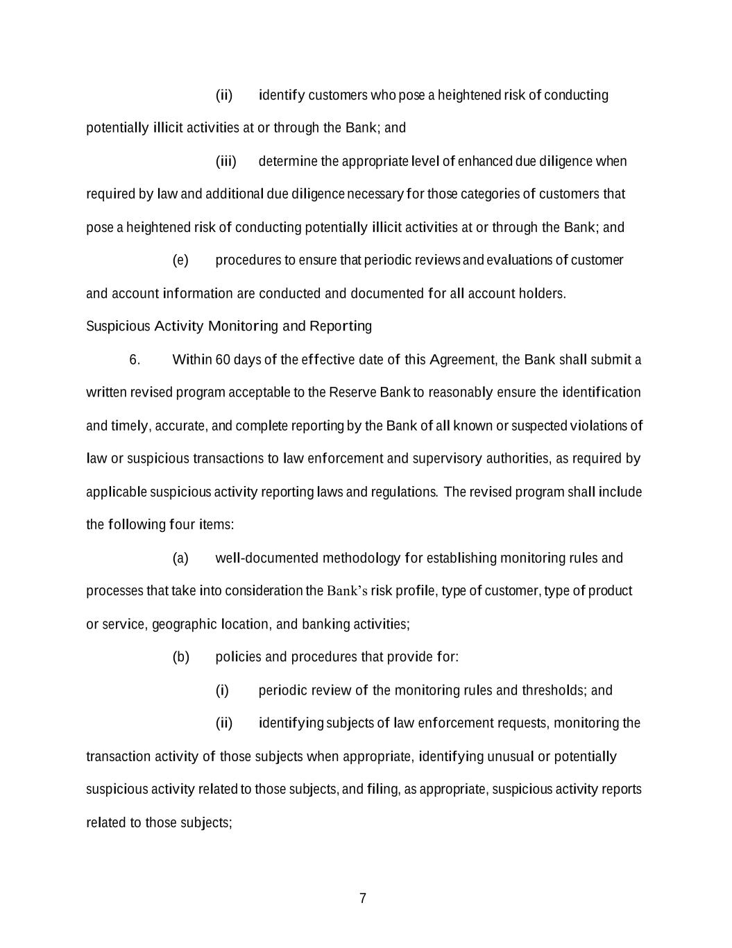7 (ii) identify customers who pose a heightened risk of conducting potentially illicit activities at or through the Bank; and (iii) determine the appropriate level of enhanced due diligence when required by law and additional due diligence necessary for those categories of customers that pose a heightened risk of conducting potentially illicit activities at or through the Bank; and (e) procedures to ensure that periodic reviews and evaluations of customer and account information are conducted and documented for all account holders. Suspicious Activity Monitoring and Reporting 6. Within 60 days of the effective date of this Agreement, the Bank shall submit a written revised program acceptable to the Reserve Bank to reasonably ensure the identification and timely, accurate, and complete reporting by the Bank of all known or suspected violations of law or suspicious transactions to law enforcement and supervisory authorities, as required by applicable suspicious activity reporting laws and regulations. The revised program shall include the following four items: (a) well-documented methodology for establishing monitoring rules and processes that take into consideration the Bank’s risk profile, type of customer, type of product or service, geographic location, and banking activities; (b) policies and procedures that provide for: (i) periodic review of the monitoring rules and thresholds; and (ii) identifying subjects of law enforcement requests, monitoring the transaction activity of those subjects when appropriate, identifying unusual or potentially suspicious activity related to those subjects, and filing, as appropriate, suspicious activity reports related to those subjects;