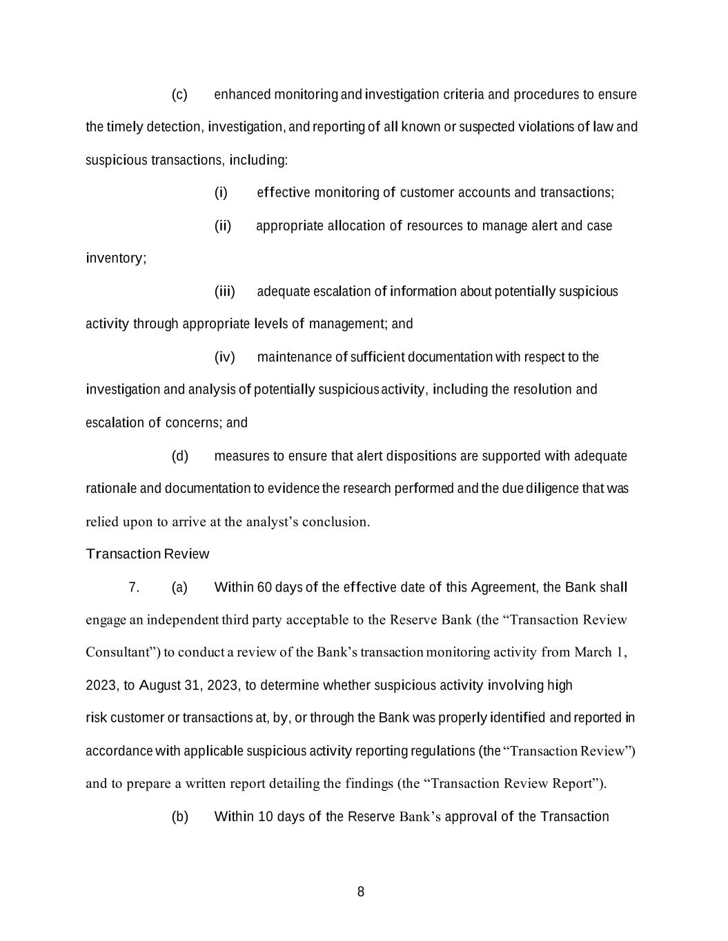 8 (c) enhanced monitoring and investigation criteria and procedures to ensure the timely detection, investigation, and reporting of all known or suspected violations of law and suspicious transactions, including: (i) effective monitoring of customer accounts and transactions; (ii) appropriate allocation of resources to manage alert and case inventory; (iii) adequate escalation of information about potentially suspicious activity through appropriate levels of management; and (iv) maintenance of sufficient documentation with respect to the investigation and analysis of potentially suspicious activity, including the resolution and escalation of concerns; and (d) measures to ensure that alert dispositions are supported with adequate rationale and documentation to evidence the research performed and the due diligence that was relied upon to arrive at the analyst’s conclusion. Transaction Review 7. (a) Within 60 days of the effective date of this Agreement, the Bank shall engage an independent third party acceptable to the Reserve Bank (the “Transaction Review Consultant”) to conduct a review of the Bank’s transaction monitoring activity from March 1, 2023, to August 31, 2023, to determine whether suspicious activity involving high risk customer or transactions at, by, or through the Bank was properly identified and reported in accordance with applicable suspicious activity reporting regulations (the “Transaction Review”) and to prepare a written report detailing the findings (the “Transaction Review Report”). (b) Within 10 days of the Reserve Bank’s approval of the Transaction