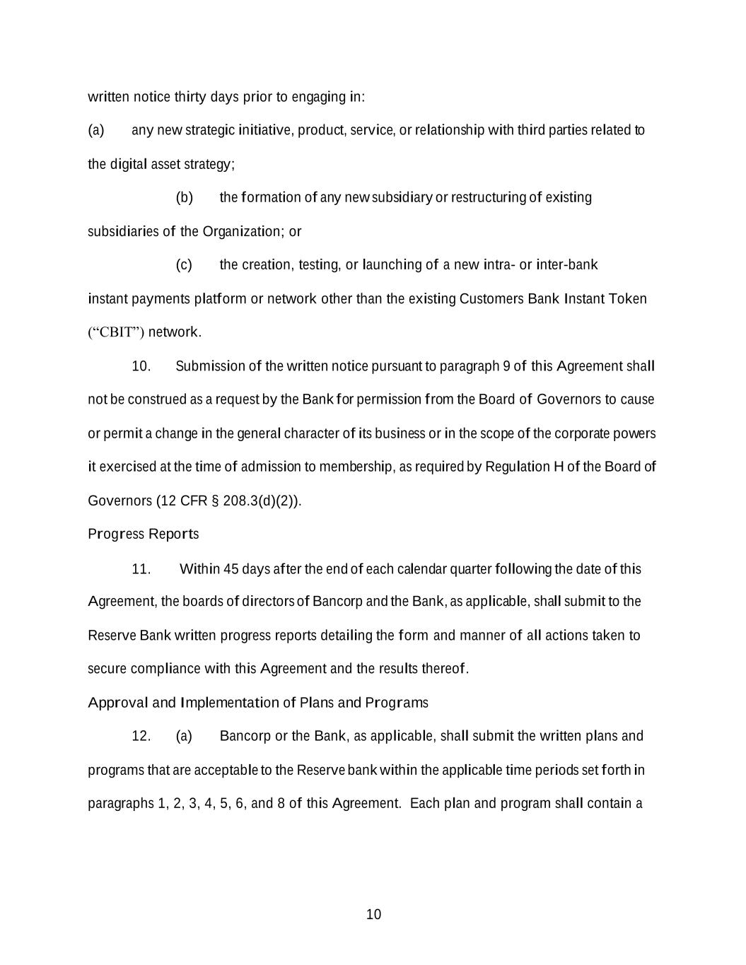 10 written notice thirty days prior to engaging in: (a) any new strategic initiative, product, service, or relationship with third parties related to the digital asset strategy; (b) the formation of any new subsidiary or restructuring of existing subsidiaries of the Organization; or (c) the creation, testing, or launching of a new intra- or inter-bank instant payments platform or network other than the existing Customers Bank Instant Token (“CBIT”) network. 10. Submission of the written notice pursuant to paragraph 9 of this Agreement shall not be construed as a request by the Bank for permission from the Board of Governors to cause or permit a change in the general character of its business or in the scope of the corporate powers it exercised at the time of admission to membership, as required by Regulation H of the Board of Governors (12 CFR § 208.3(d)(2)). Progress Reports 11. Within 45 days after the end of each calendar quarter following the date of this Agreement, the boards of directors of Bancorp and the Bank, as applicable, shall submit to the Reserve Bank written progress reports detailing the form and manner of all actions taken to secure compliance with this Agreement and the results thereof. Approval and Implementation of Plans and Programs 12. (a) Bancorp or the Bank, as applicable, shall submit the written plans and programs that are acceptable to the Reserve bank within the applicable time periods set forth in paragraphs 1, 2, 3, 4, 5, 6, and 8 of this Agreement. Each plan and program shall contain a