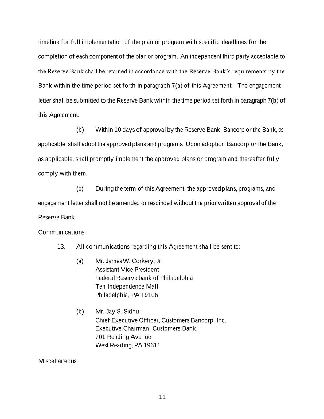 11 timeline for full implementation of the plan or program with specific deadlines for the completion of each component of the plan or program. An independent third party acceptable to the Reserve Bank shall be retained in accordance with the Reserve Bank’s requirements by the Bank within the time period set forth in paragraph 7(a) of this Agreement. The engagement letter shall be submitted to the Reserve Bank within the time period set forth in paragraph 7(b) of this Agreement. (b) Within 10 days of approval by the Reserve Bank, Bancorp or the Bank, as applicable, shall adopt the approved plans and programs. Upon adoption Bancorp or the Bank, as applicable, shall promptly implement the approved plans or program and thereafter fully comply with them. (c) During the term of this Agreement, the approved plans, programs, and engagement letter shall not be amended or rescinded without the prior written approval of the Reserve Bank. Communications 13. All communications regarding this Agreement shall be sent to: (a) Mr. James W. Corkery, Jr. Assistant Vice President Federal Reserve bank of Philadelphia Ten Independence Mall Philadelphia, PA 19106 (b) Mr. Jay S. Sidhu Chief Executive Officer, Customers Bancorp, Inc. Executive Chairman, Customers Bank 701 Reading Avenue West Reading, PA 19611 Miscellaneous