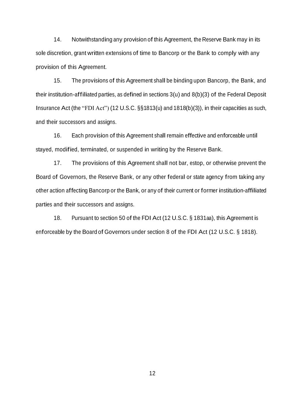 12 14. Notwithstanding any provision of this Agreement, the Reserve Bank may in its sole discretion, grant written extensions of time to Bancorp or the Bank to comply with any provision of this Agreement. 15. The provisions of this Agreement shall be binding upon Bancorp, the Bank, and their institution-affiliated parties, as defined in sections 3(u) and 8(b)(3) of the Federal Deposit Insurance Act (the “FDI Act”) (12 U.S.C. §§1813(u) and 1818(b)(3)), in their capacities as such, and their successors and assigns. 16. Each provision of this Agreement shall remain effective and enforceable until stayed, modified, terminated, or suspended in writing by the Reserve Bank. 17. The provisions of this Agreement shall not bar, estop, or otherwise prevent the Board of Governors, the Reserve Bank, or any other federal or state agency from taking any other action affecting Bancorp or the Bank, or any of their current or former institution-affiliated parties and their successors and assigns. 18. Pursuant to section 50 of the FDI Act (12 U.S.C. § 1831aa), this Agreement is enforceable by the Board of Governors under section 8 of the FDI Act (12 U.S.C. § 1818).