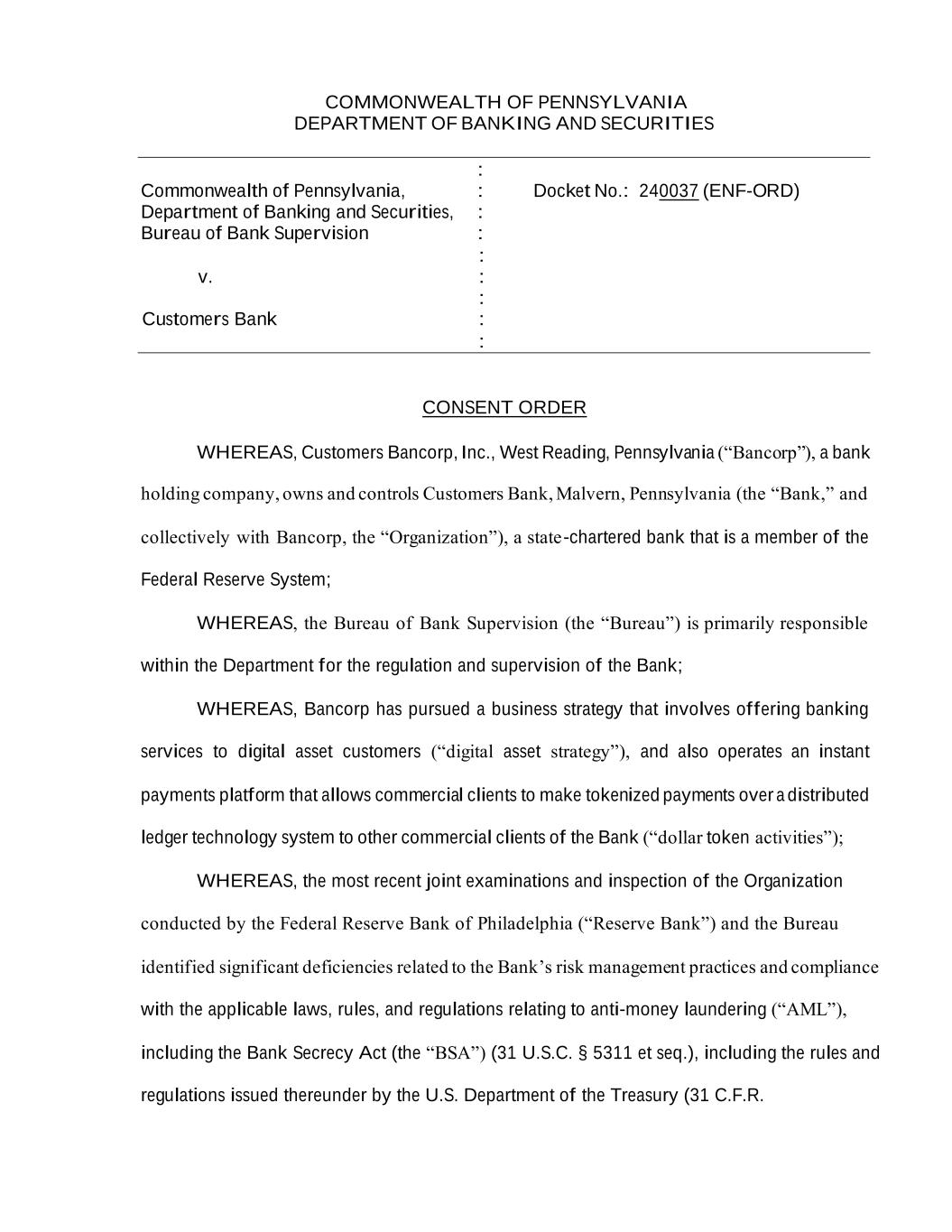 COMMONWEALTH OF PENNSYLVANIA DEPARTMENT OF BANKING AND SECURITIES : Commonwealth of Pennsylvania, : Docket No.: 240037 (ENF-ORD) Department of Banking and Securities, : Bureau of Bank Supervision : : v. : : Customers Bank : : CONSENT ORDER WHEREAS, Customers Bancorp, Inc., West Reading, Pennsylvania (“Bancorp”), a bank holding company, owns and controls Customers Bank, Malvern, Pennsylvania (the “Bank,” and collectively with Bancorp, the “Organization”), a state-chartered bank that is a member of the Federal Reserve System; WHEREAS, the Bureau of Bank Supervision (the “Bureau”) is primarily responsible within the Department for the regulation and supervision of the Bank; WHEREAS, Bancorp has pursued a business strategy that involves offering banking services to digital asset customers (“digital asset strategy”), and also operates an instant payments platform that allows commercial clients to make tokenized payments over a distributed ledger technology system to other commercial clients of the Bank (“dollar token activities”); WHEREAS, the most recent joint examinations and inspection of the Organization conducted by the Federal Reserve Bank of Philadelphia (“Reserve Bank”) and the Bureau identified significant deficiencies related to the Bank’s risk management practices and compliance with the applicable laws, rules, and regulations relating to anti-money laundering (“AML”), including the Bank Secrecy Act (the “BSA”) (31 U.S.C. § 5311 et seq.), including the rules and regulations issued thereunder by the U.S. Department of the Treasury (31 C.F.R.